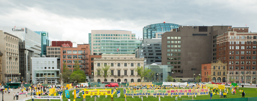 来自多伦多、蒙特利尔、渥太华和滑铁卢的法轮功学员渥太华市中心的Sparks街举行游行,天国乐团为市民进行了精彩的演出,在国会山前,法轮功学员以图片展、天国乐团、腰鼓、中国古典舞等表演形式庆祝法轮大法弘传廿一周年。