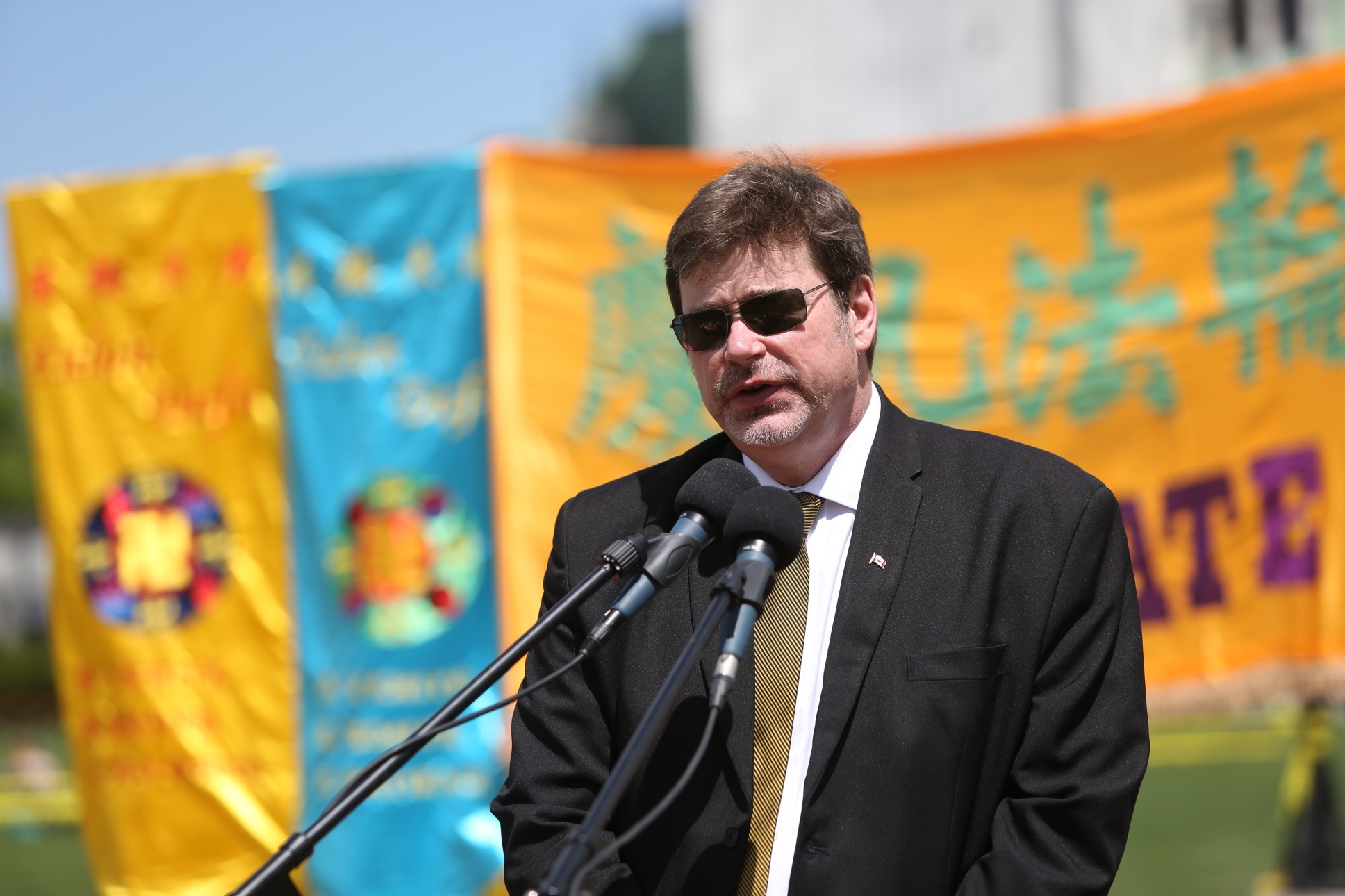 他对在场的全体法轮功学员说:“我钦佩你们的尊严,你们面对逆境的坚韧不拔。我站在这里,是基于法轮大法真善忍原则的共同理念。这是给予我们,也是给予你们力量的价值观,我很荣幸今天能站在你们的面前。”