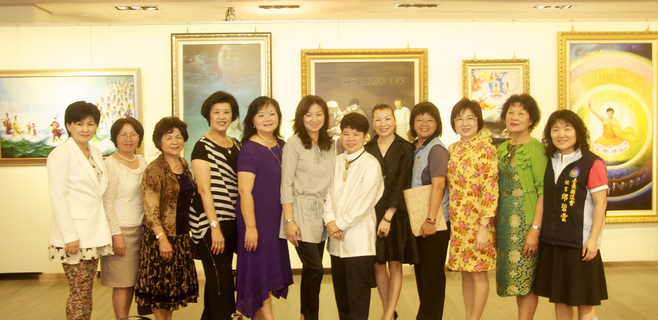 ![]() 台东市长夫人郑晨芸(左六)率同台东妇女界精英观赏画作,盛赞美展的真善忍 精神值得大家学习 |