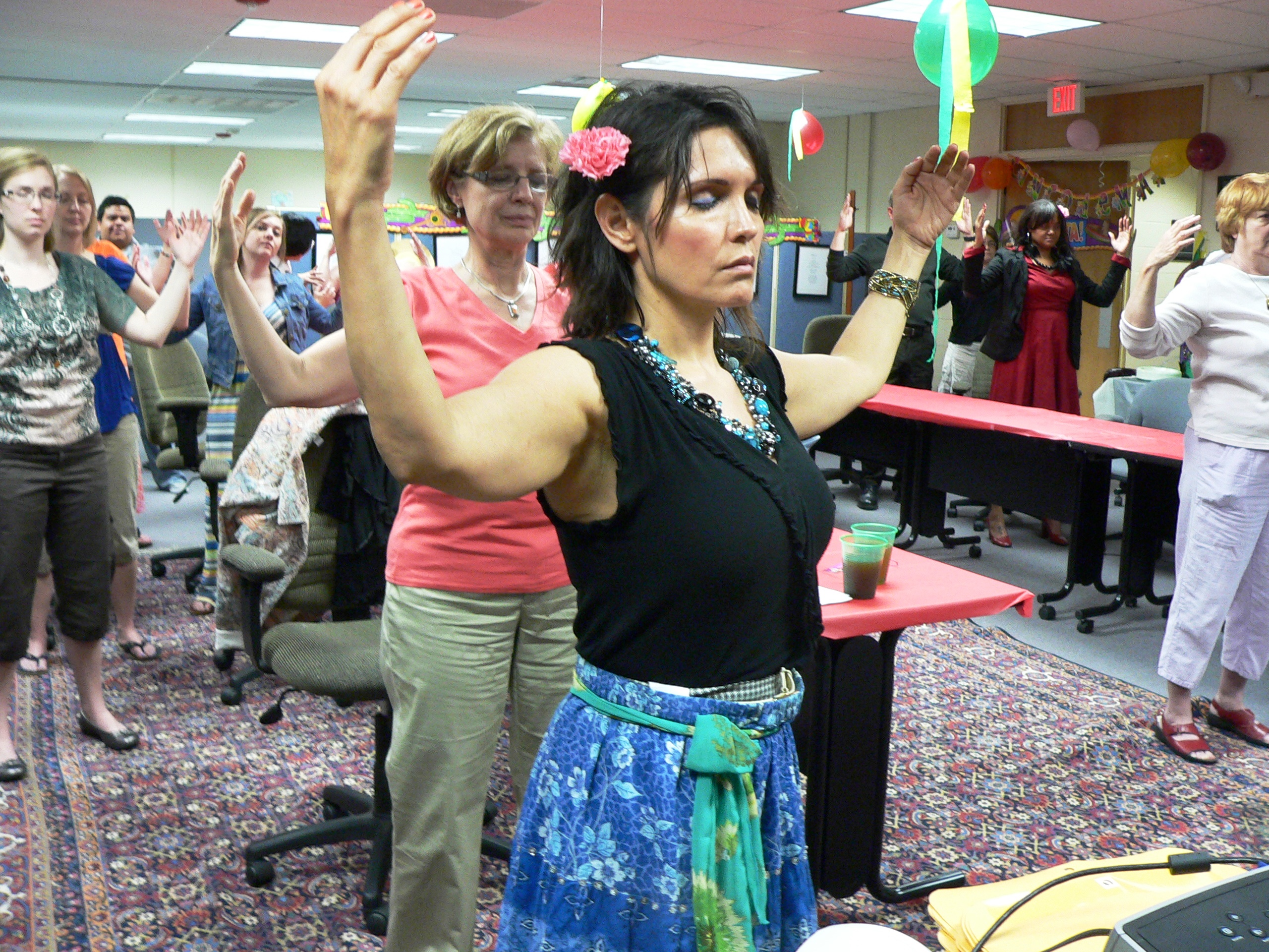 活动中,法轮功学员系统的介绍了法轮大法“真、善、忍”的原则以及五套功法如何带给全世界不同族裔亿万民众道德的回升以及健康的身体。与会者们的共同愿望是:我们要学习五套功法!随着屏幕上李洪志老师的功法演示,每一位来宾都认真地学炼了前四套功法。当得知世界法轮大法日即将来临时,与会者高兴地庆祝这个节日,大家双手合十,预祝法轮功创始人李洪志先生生日快乐。