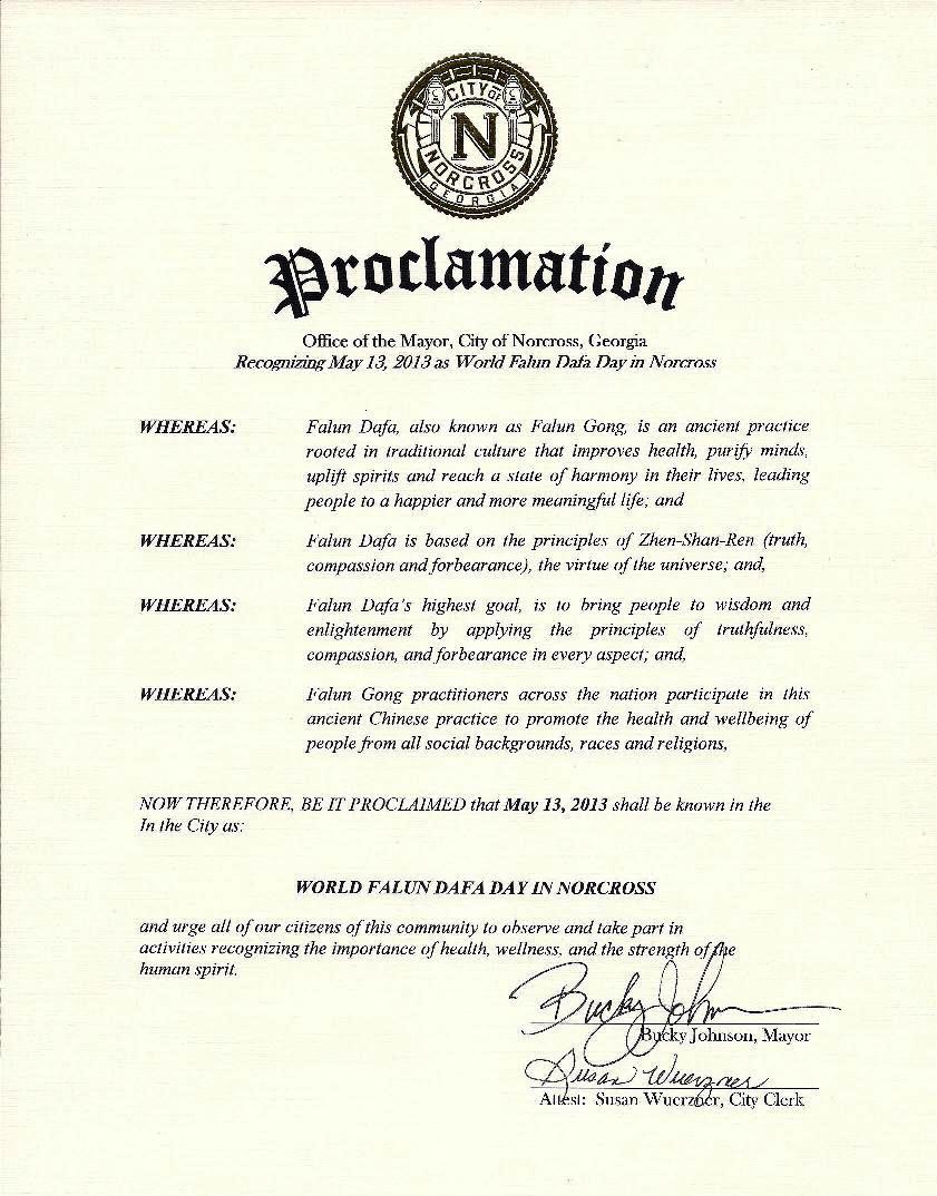 现在,我特此宣布,二零一三年五月十三日为乔治亚州诺克罗斯“世界法轮大法日”,并敦促我市所有的公民庆祝并参加这一有益身心健康和提高精神力量的活动。