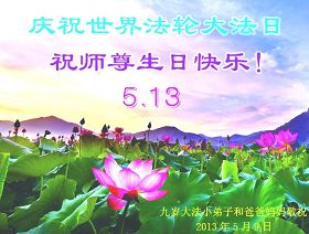 甘肃省兰州新得法的大法弟子恭祝师尊生日快乐!恭贺世界法轮大法日!弟子感谢师尊慈悲救度!人人都想追求真理,但真理不是随便可得的,得付出,甚至巨大的付出,才配的上得到宇宙真理,换句话说,得是个与真理相配的生命!伟大慈悲的主佛,我们伟大至高至上的师尊,亲临人世间洪传宇宙大法,开天辟地的佛恩浩荡,能成为师尊的弟子并且在人间助师正法救度众生是何等的荣耀!请师尊放心,弟子决不负师命,弟子会倍加珍惜此刻的每一天,实修自己,履行责任,兑现誓约,跟师尊圆满的回家!跪拜师尊!合十!山东新得法的大法弟子恭祝师尊生日快乐!恭贺世界法轮大法日!弟子感恩师尊慈悲苦度洪恩!弟子有缘得到这万古难遇的宇宙大法,真是三生有幸!自从得法以后,弟子身心得到了天翻地覆、脱胎换骨的变化,不再追名逐利,人世间的一切,对弟子来讲都是过眼烟云,那种超然世外的轻松和愉悦是不修炼的常人永远也无法体会到的!师尊给予弟子的一切,弟子用人间的任何语言都无法描述!弟子唯有多学法,做好三件事,多救众生,让师尊多一分欣慰,少一分操劳,才能对得起师尊为弟子所做的一切!跪拜师尊!合十!山西省临汾市侯马市一对新学员夫妻大法弟子恭祝师父生日快乐!祝5.13法轮大法日!我们是2009年的新学员,一个在魔窟,一个在家,不管在哪,我们都会记住,我们是师父的弟子,主佛的弟子,在什么环境下都会做好三件事,争取和师父回家。