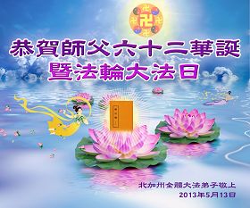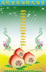 云南被非法关押在看守所、劳教所、监狱的大法弟子恭祝师尊华诞!普天同庆世界法轮大法日!被非法关押在四川省女子监狱迫害的大法弟子恭贺大法洪传二十一周年!热烈庆祝世界法轮大法日!云南全体被非法关押的大法弟子恭祝师尊生日快乐!敬贺5.13世界法轮大法日!被非法关押在监狱、劳教所、洗脑班、看守所等的北京市、天津市、深圳市全体大法弟子遥祝慈悲伟大的师父生日快乐!湖南省常德市津市被非法关押在监狱的大法弟子恭祝师父生日快乐!庆祝 “5.13” 世界法轮大法日暨法轮大法洪传二十一周年!福建省福州在监狱中被迫害的大法弟子庆贺世界法轮大法日,恭祝师尊华诞!吉林省三姐妹恭祝慈悲伟大的师尊生日快乐!二零一三年五月十三日,我们法轮大法弟子又迎来了慈悲伟大的师尊六十二岁寿诞!大法轮大法传世二十一周年!世界法轮大法日!在这普天同庆的时刻,我们三姐妹怀着无比感恩的心双手合十!恭祝慈悲伟大的师尊生日快乐!师尊您辛苦了!我们要在这有限的时间里,多学法,向内找,修好自己,做好三件事,勇猛精進多救人,完成我们的史前大愿,不辜负师尊的慈悲苦度,圆满随师回家园。