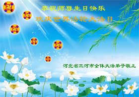 河北省廊坊市三河市全体大法弟子恭祝师尊生日快乐!祝贺法轮大法洪传二十一周年!普天同庆“世界法轮大法日”!我们一定精進实修,协调配合,做好三件事,救度更多有缘众生。