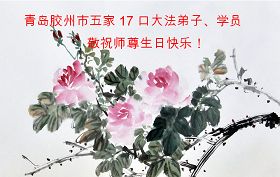 山东省青岛市胶州市五家17名大法弟子、学员敬祝师尊生日快乐!鲜花一束寄师尊,一片赤诚敬亲人;风风雨雨随师走,火海刀山不变心。