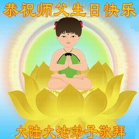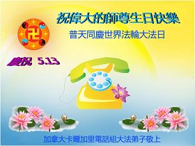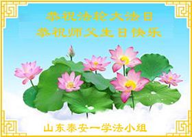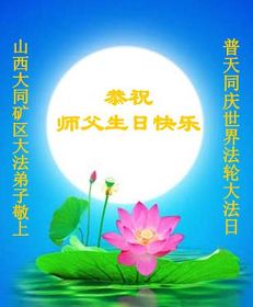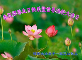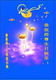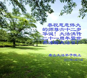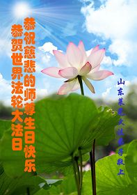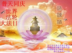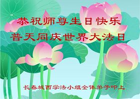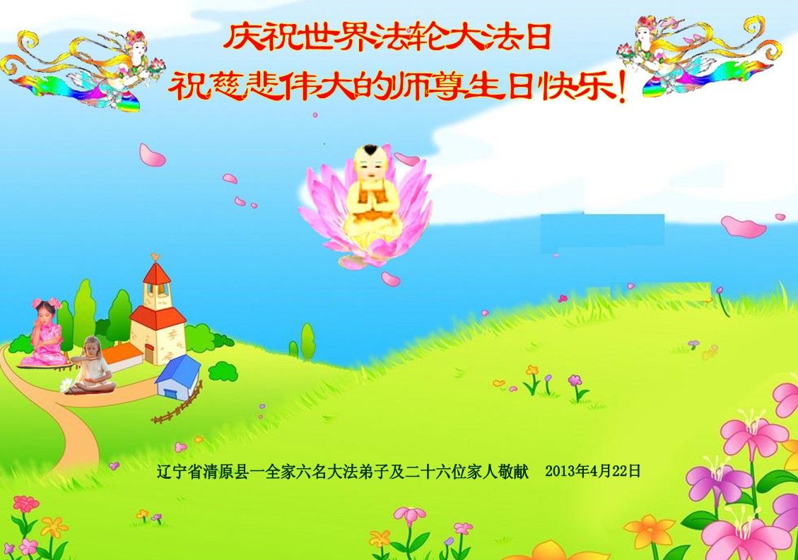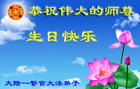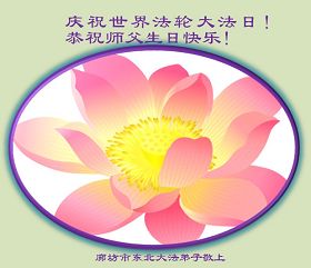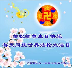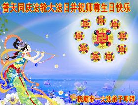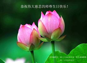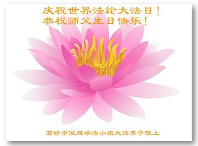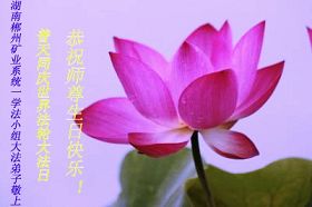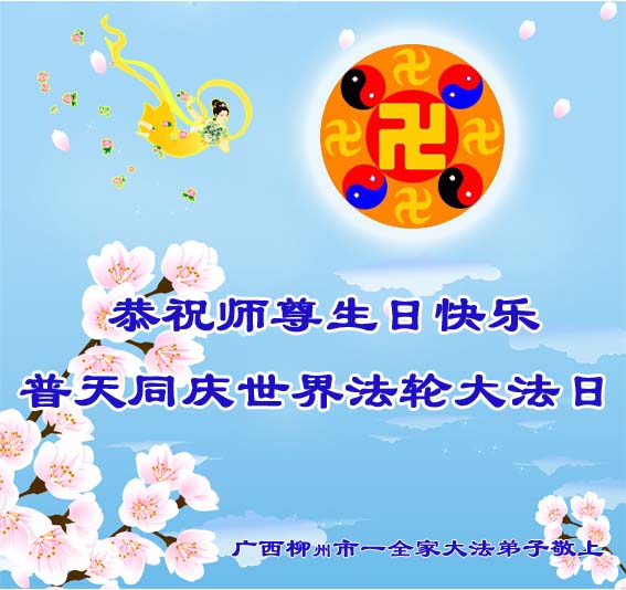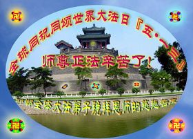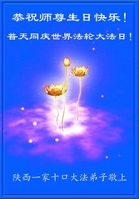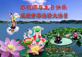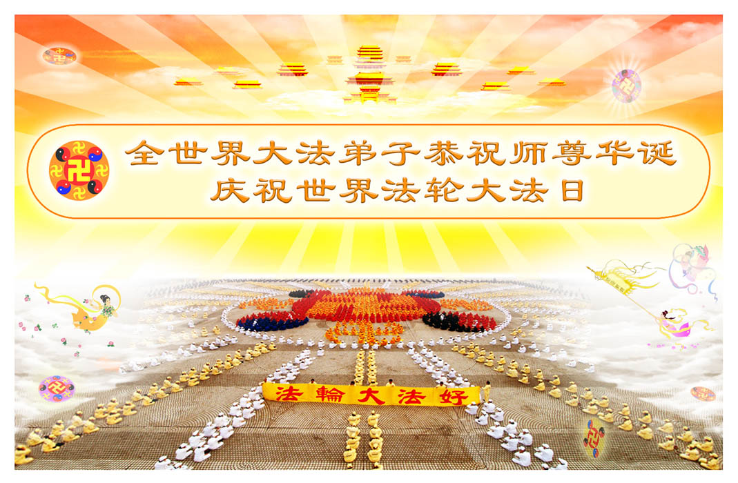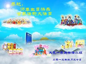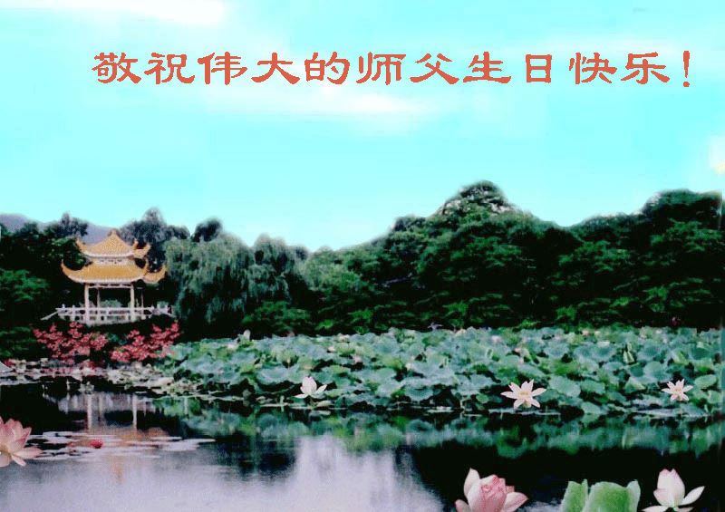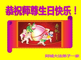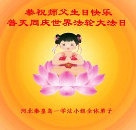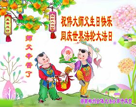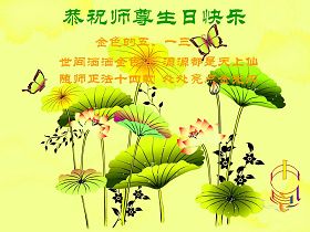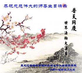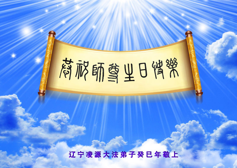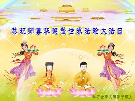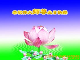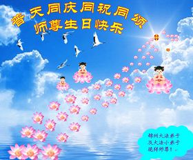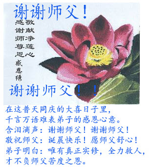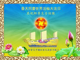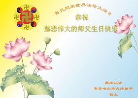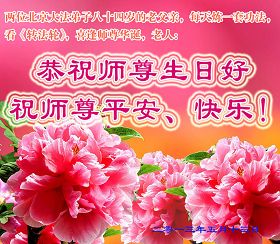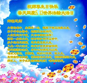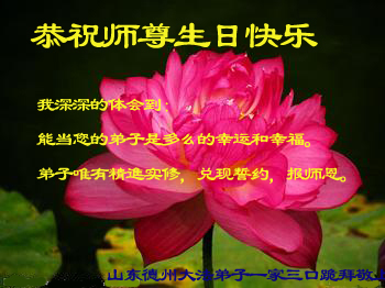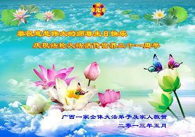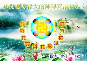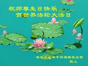 慈悲伟大的师尊: 您好!一年一度的法轮大法日已经来临,在这普天同庆的盛大节日里,我们更加思念远在异国他乡的恩师,更加倍感师尊的慈悲苦度之恩,更加体悟到恩师洪大的慈悲和弟子责任的重大,我们的心情难以用语言来表达、千言万语汇成一句话:师尊辛苦了!在此,弟子代表全家和亲友以及明真相的世人真诚的拜谢师尊。请师尊放心,我们将用师父所给予我们的智慧和能力,根据各自不同的特点和特长,在不同的环境,用不同的方式,智慧地证实大法;用各种方式,广传真相,唤醒世人,救度众生,走好师尊安排好的回归神路,兑现誓约,随师归家。