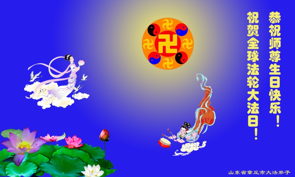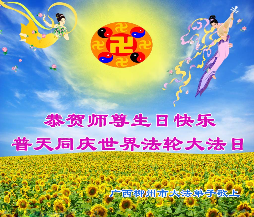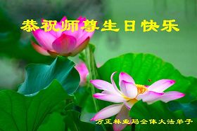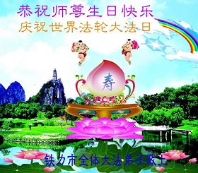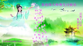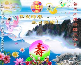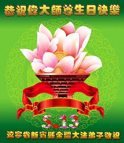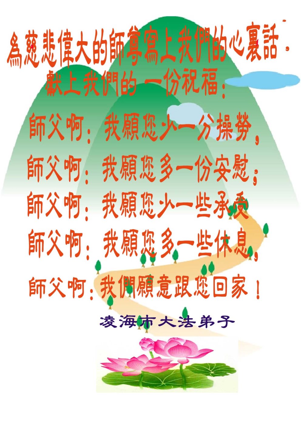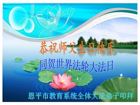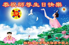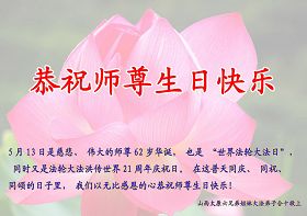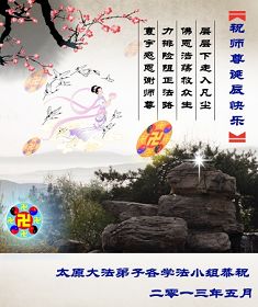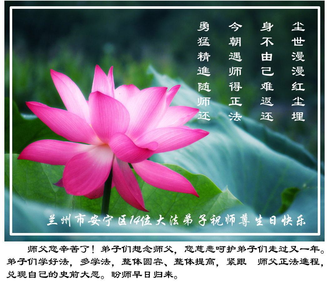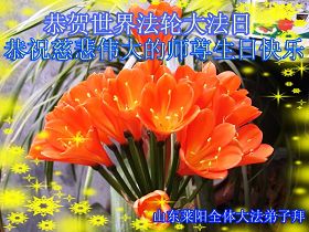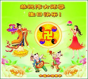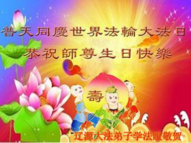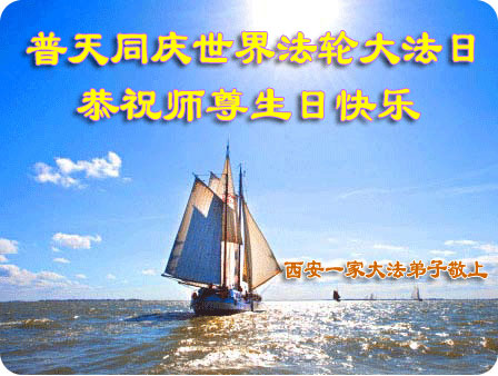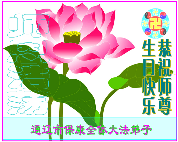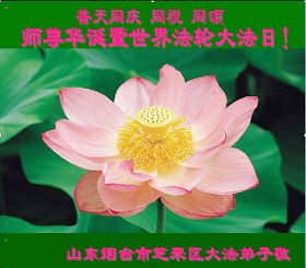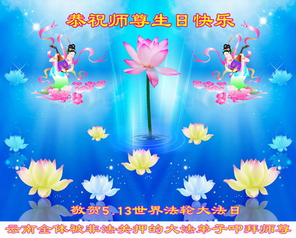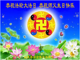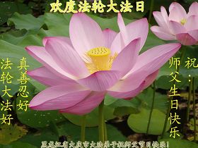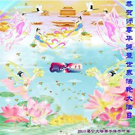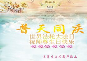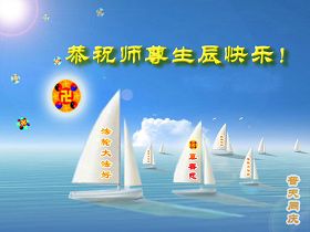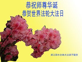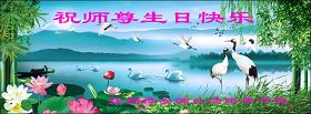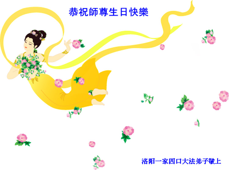 慈悲伟大的师尊: 您好!一年一度的法轮大法日已经来临,在这普天同庆的盛大节日里,我们更加思念远在异国他乡的恩师,更加倍感师尊的慈悲苦度之恩,更加体悟到恩师洪大的慈悲和弟子责任的重大,我们的心情难以用语言来表达、千言万语汇成一句话:师尊辛苦了!在此,弟子代表全家和亲友以及明真相的世人真诚的拜谢师尊。请师尊放心,我们将用师父所给予我们的智慧和能力,根据各自不同的特点和特长,在不同的环境,用不同的方式,智慧地证实大法;用各种方式,广传真相,唤醒世人,救度众生,走好师尊安排好的回归神路,兑现誓约,随师归家。