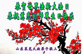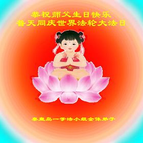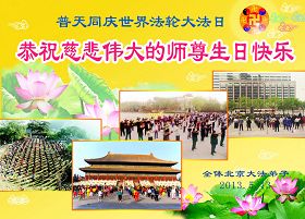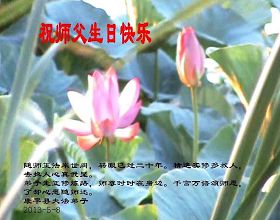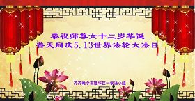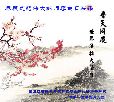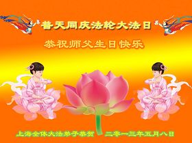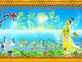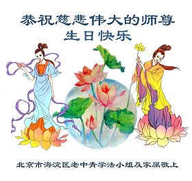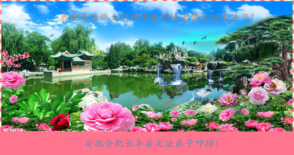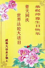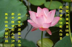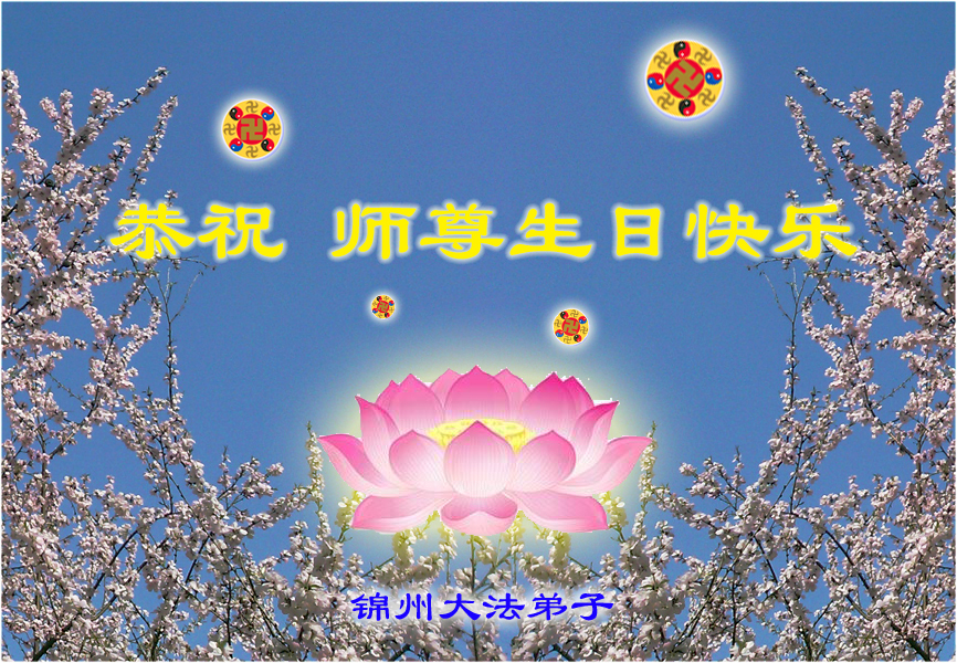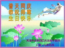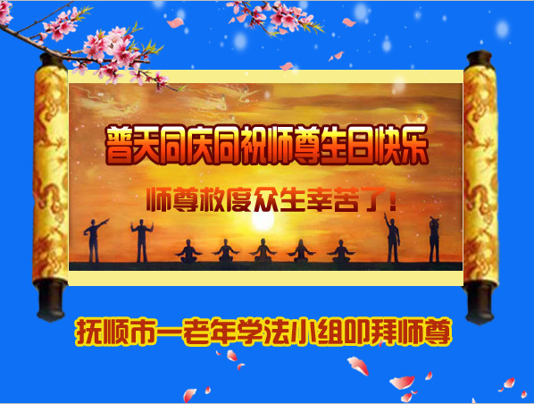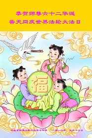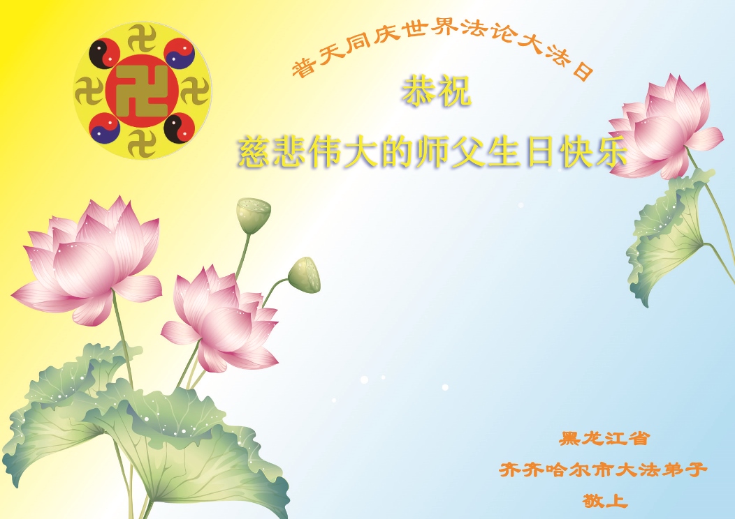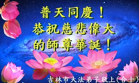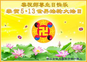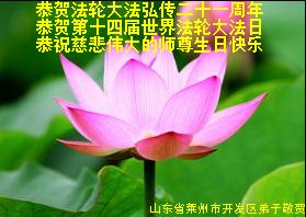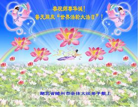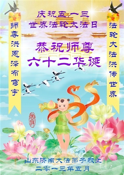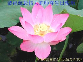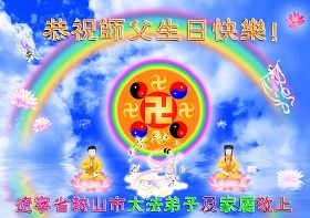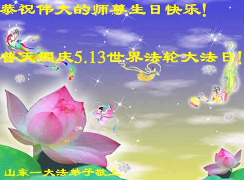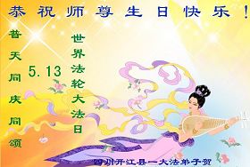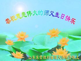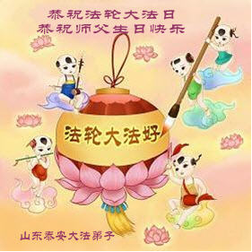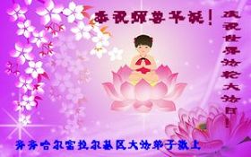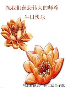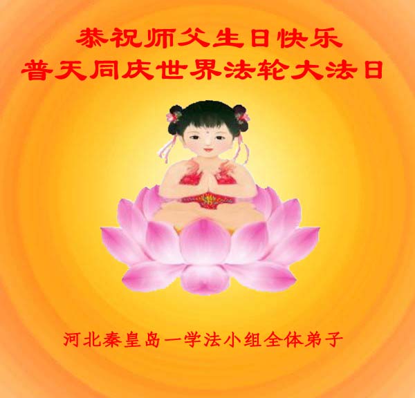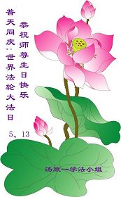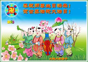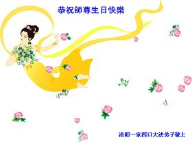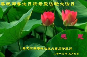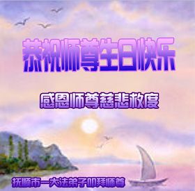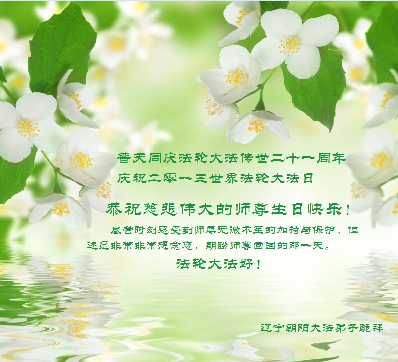 慈悲伟大的师尊: 您好!一年一度的法轮大法日已经来临,在这普天同庆的盛大节日里,我们更加思念远在异国他乡的恩师,更加倍感师尊的慈悲苦度之恩,更加体悟到恩师洪大的慈悲和弟子责任的重大,我们的心情难以用语言来表达、千言万语汇成一句话:师尊辛苦了!在此,弟子代表全家和亲友以及明真相的世人真诚的拜谢师尊。请师尊放心,我们将用师父所给予我们的智慧和能力,根据各自不同的特点和特长,在不同的环境,用不同的方式,智慧地证实大法;用各种方式,广传真相,唤醒世人,救度众生,走好师尊安排好的回归神路,兑现誓约,随师归家。