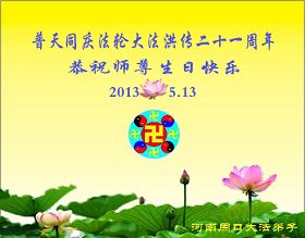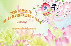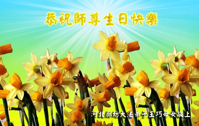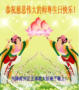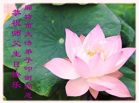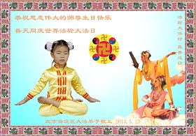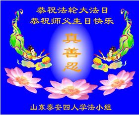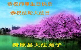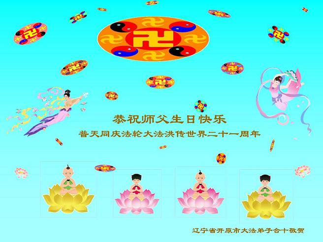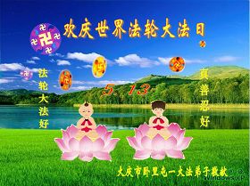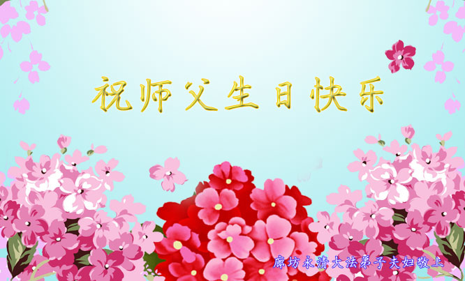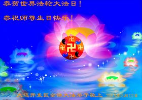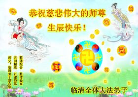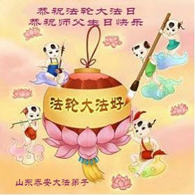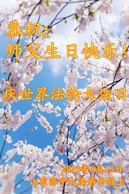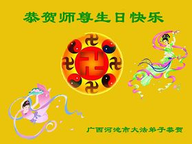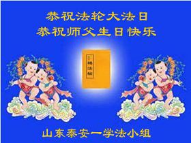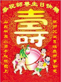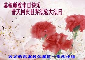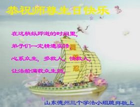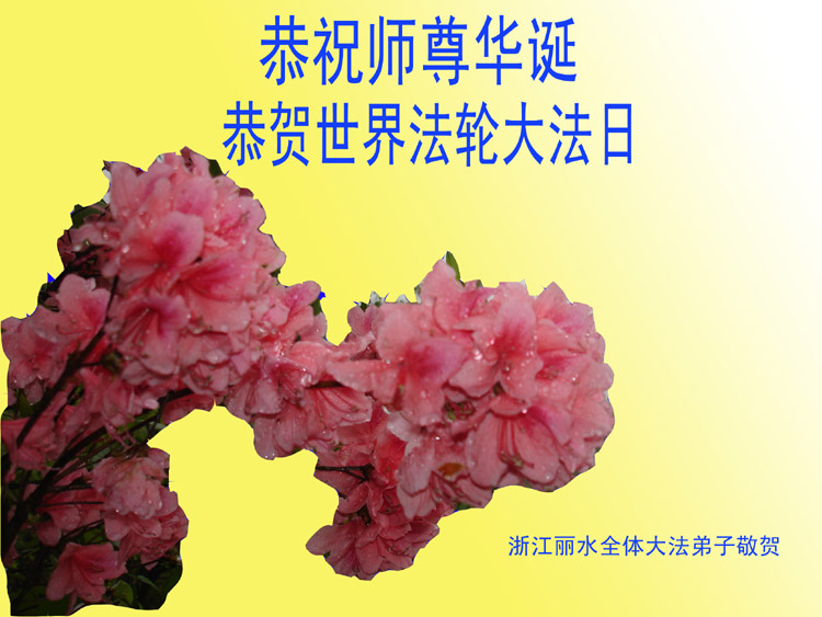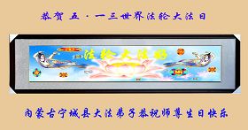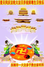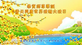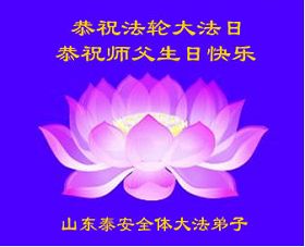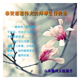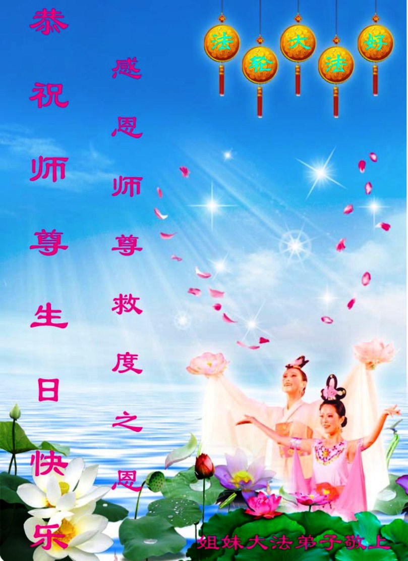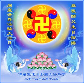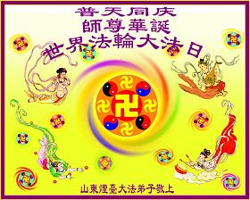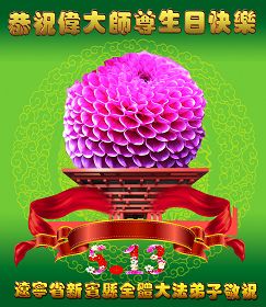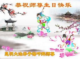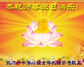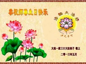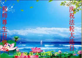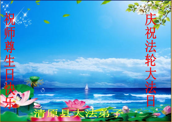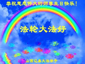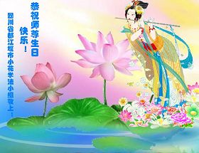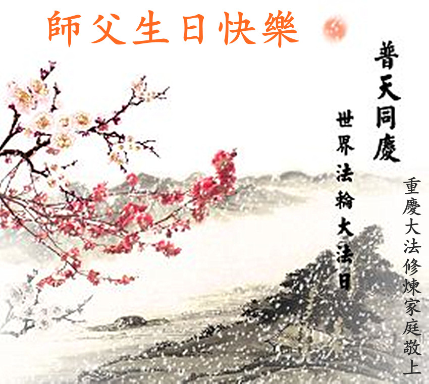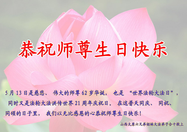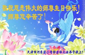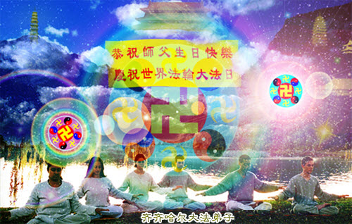 慈悲伟大的师尊: 您好!一年一度的法轮大法日已经来临,在这普天同庆的盛大节日里,我们更加思念远在异国他乡的恩师,更加倍感师尊的慈悲苦度之恩,更加体悟到恩师洪大的慈悲和弟子责任的重大,我们的心情难以用语言来表达、千言万语汇成一句话:师尊辛苦了!在此,弟子代表全家和亲友以及明真相的世人真诚的拜谢师尊。请师尊放心,我们将用师父所给予我们的智慧和能力,根据各自不同的特点和特长,在不同的环境,用不同的方式,智慧地证实大法;用各种方式,广传真相,唤醒世人,救度众生,走好师尊安排好的回归神路,兑现誓约,随师归家。