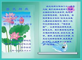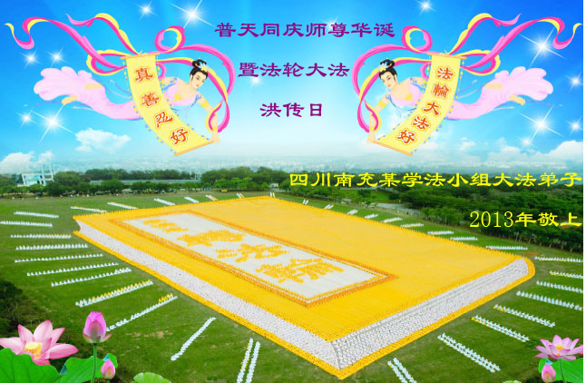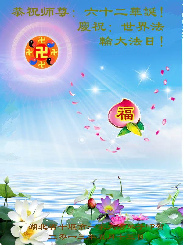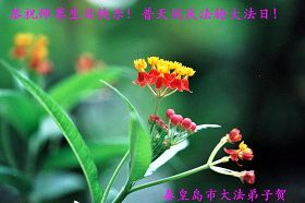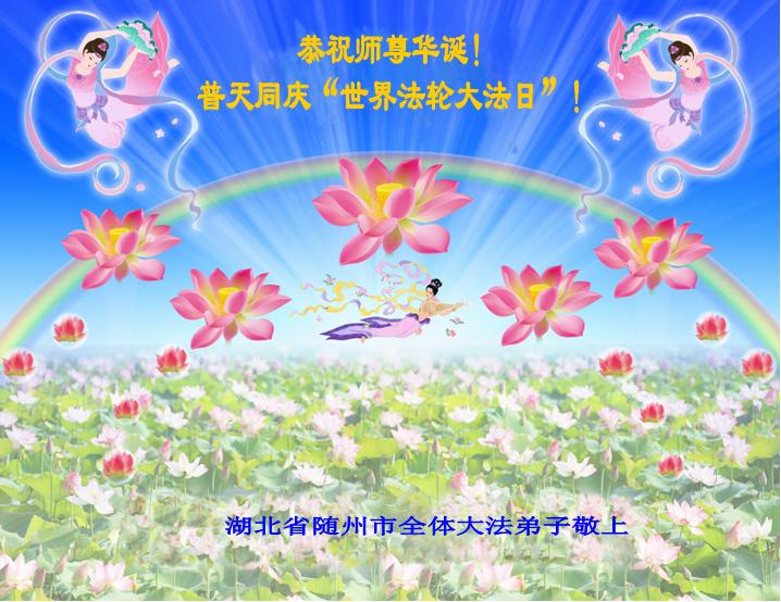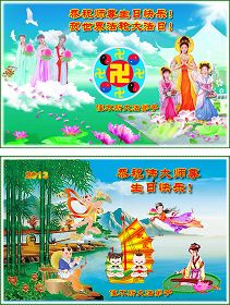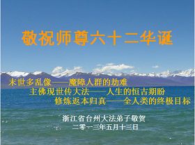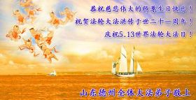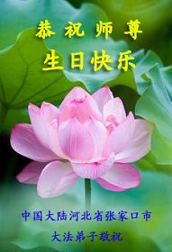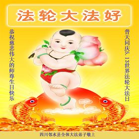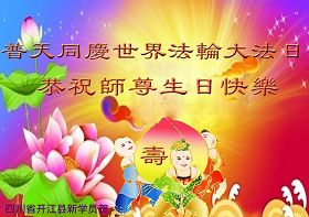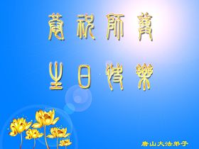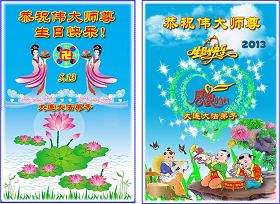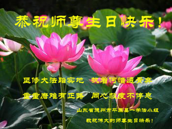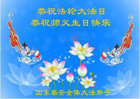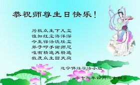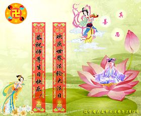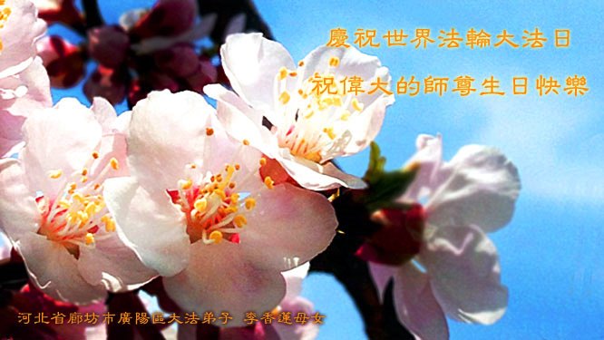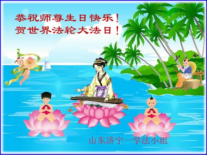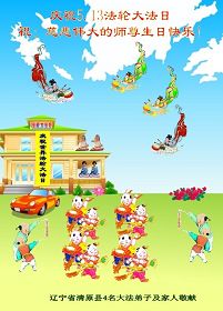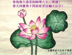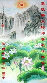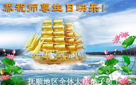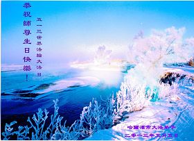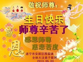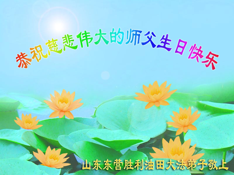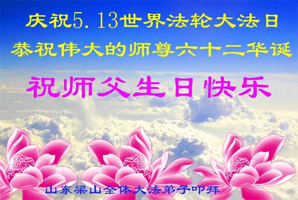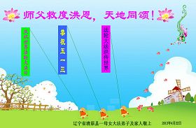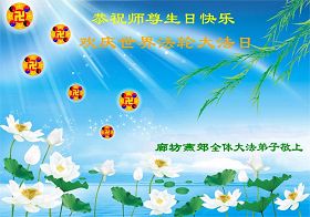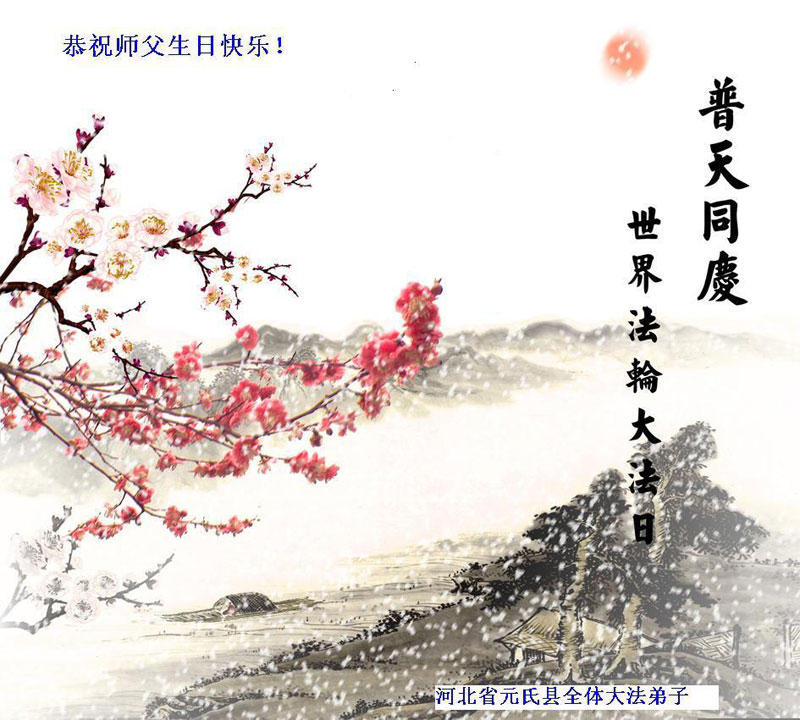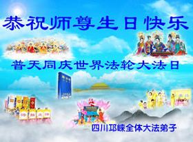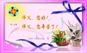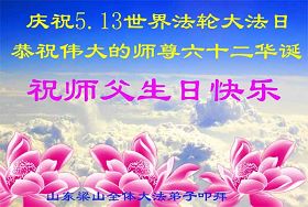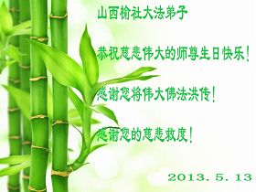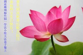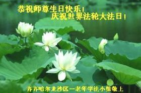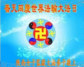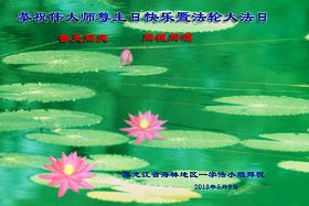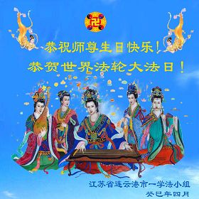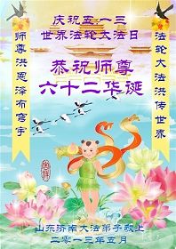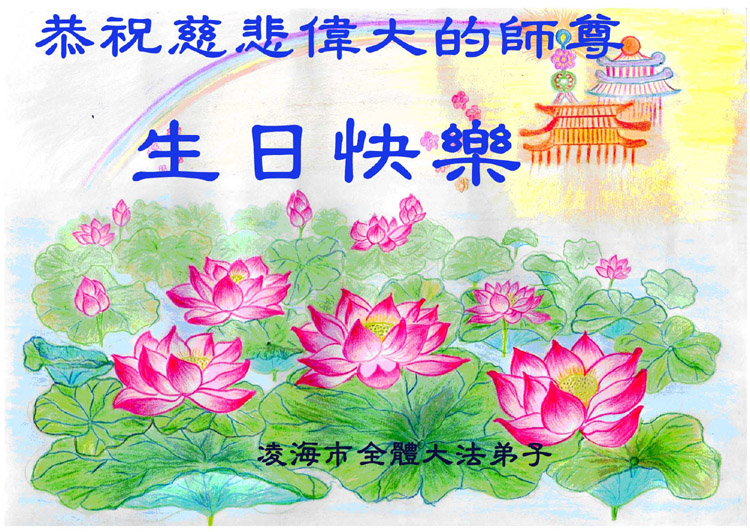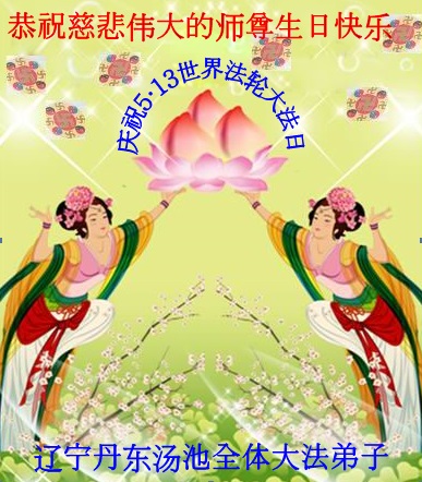 慈悲伟大的师尊: 您好!一年一度的法轮大法日已经来临,在这普天同庆的盛大节日里,我们更加思念远在异国他乡的恩师,更加倍感师尊的慈悲苦度之恩,更加体悟到恩师洪大的慈悲和弟子责任的重大,我们的心情难以用语言来表达、千言万语汇成一句话:师尊辛苦了!在此,弟子代表全家和亲友以及明真相的世人真诚的拜谢师尊。请师尊放心,我们将用师父所给予我们的智慧和能力,根据各自不同的特点和特长,在不同的环境,用不同的方式,智慧地证实大法;用各种方式,广传真相,唤醒世人,救度众生,走好师尊安排好的回归神路,兑现誓约,随师归家。