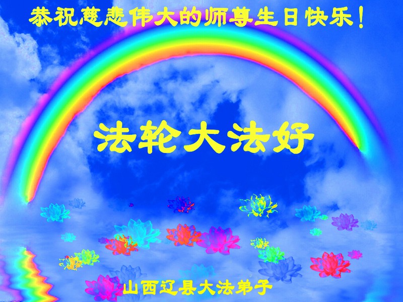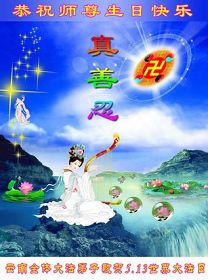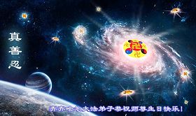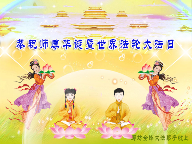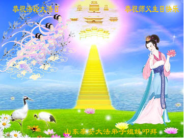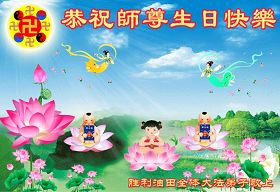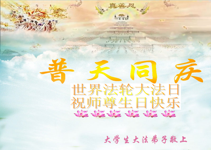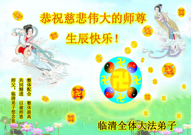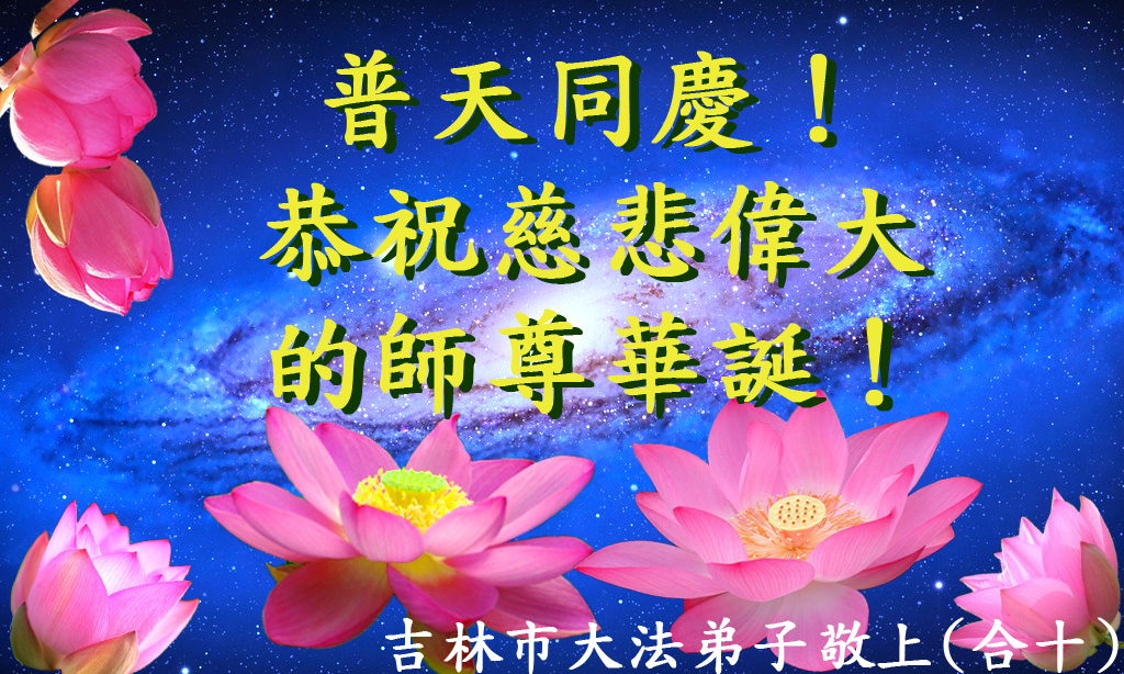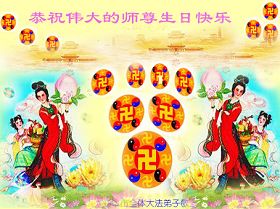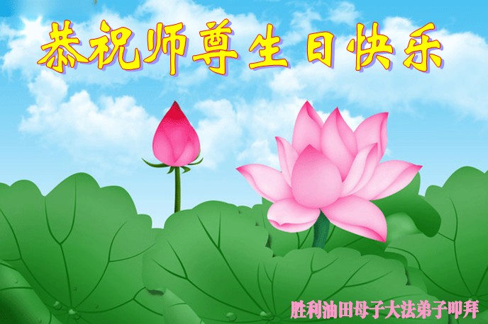 慈悲伟大的师尊好!师尊, 您辛苦了!在这普天同庆同贺的幸福之时,我们首先叩谢师恩!是您把我们从地狱中捞起来洗净,替我们承担了千百年犯下的罪,是您为弟子净化身心,使道德回升。您为弟子费尽苦心,承受付出得太多太多,弟子无以回报,我们唯有精進,遵照师尊教导:“越到最后越不能放松,越到最后越要学好法,越到最后正念要越足”(《二零零七年纽约法会讲法》), 用心做好三件事,特别要持之以恒学好大法,遇事向内找,多去人心,提高自己才能多救众生,不负师尊的慈悲救度与众生的期盼。