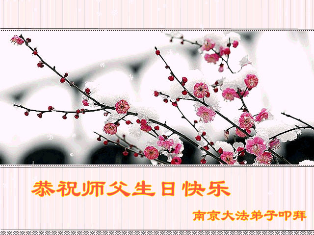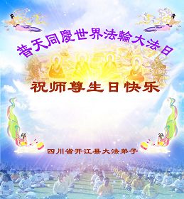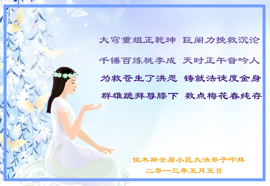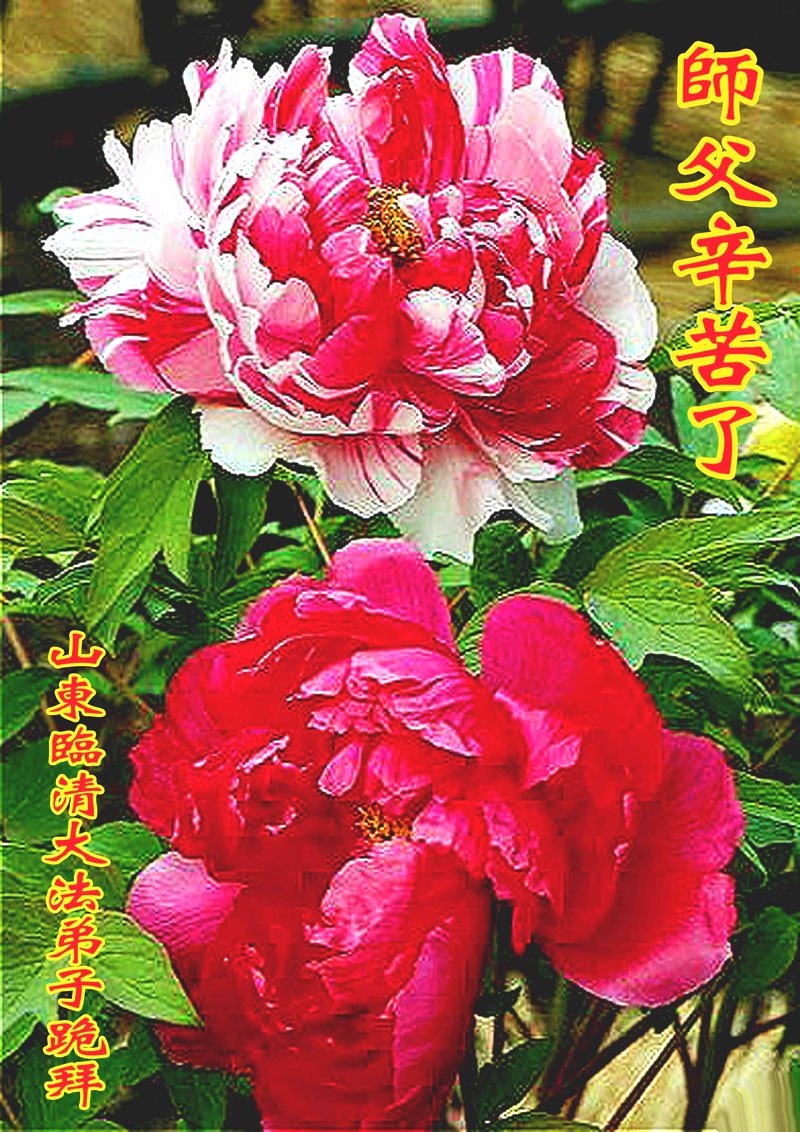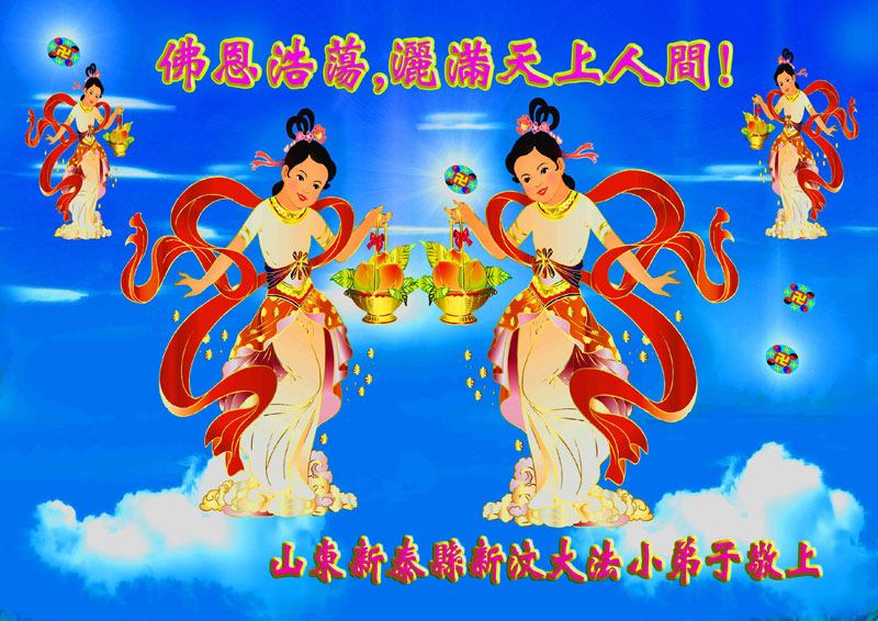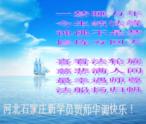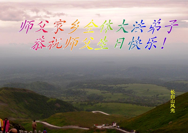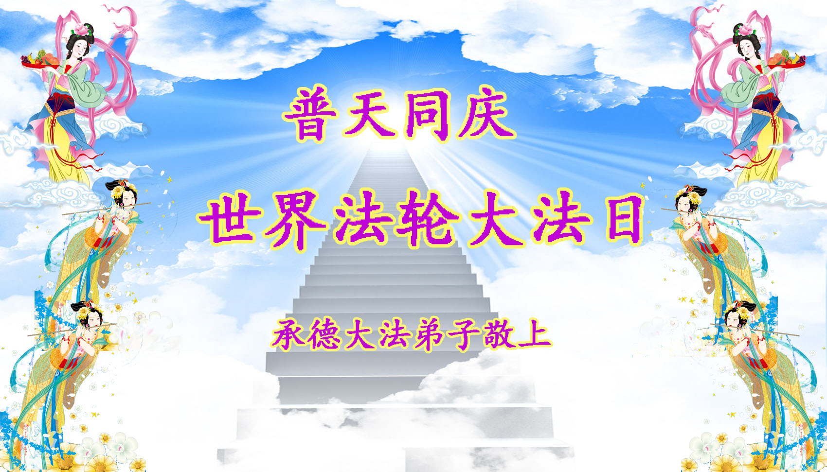 慈悲伟大的师尊好!师尊, 您辛苦了!在这普天同庆同贺的幸福之时,我们首先叩谢师恩!是您把我们从地狱中捞起来洗净,替我们承担了千百年犯下的罪,是您为弟子净化身心,使道德回升。您为弟子费尽苦心,承受付出得太多太多,弟子无以回报,我们唯有精進,遵照师尊教导:“越到最后越不能放松,越到最后越要学好法,越到最后正念要越足”(《二零零七年纽约法会讲法》), 用心做好三件事,特别要持之以恒学好大法,遇事向内找,多去人心,提高自己才能多救众生,不负师尊的慈悲救度与众生的期盼。