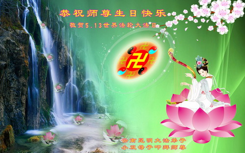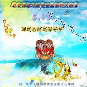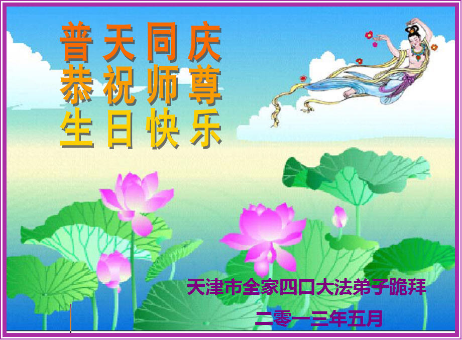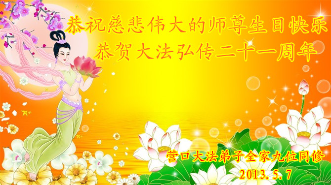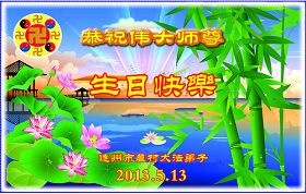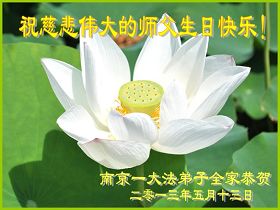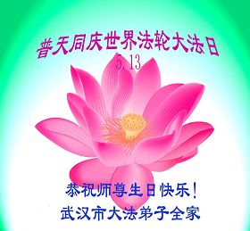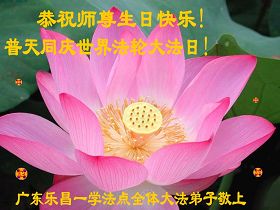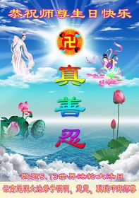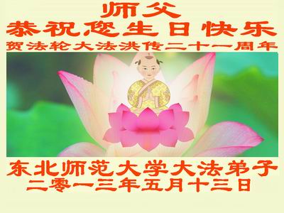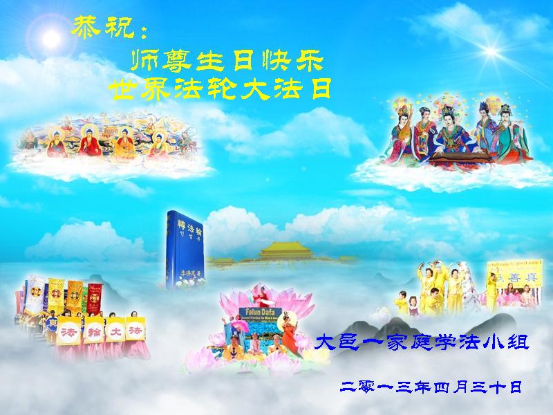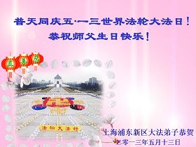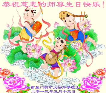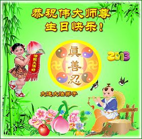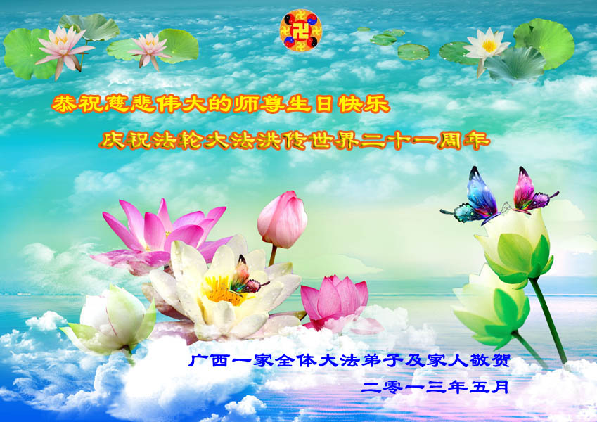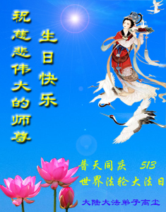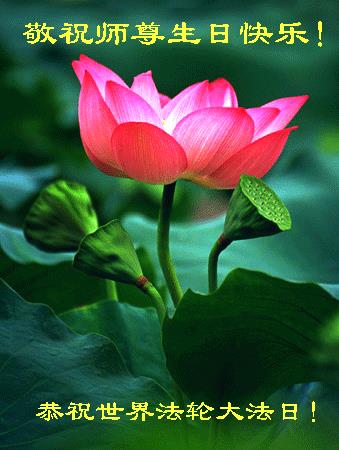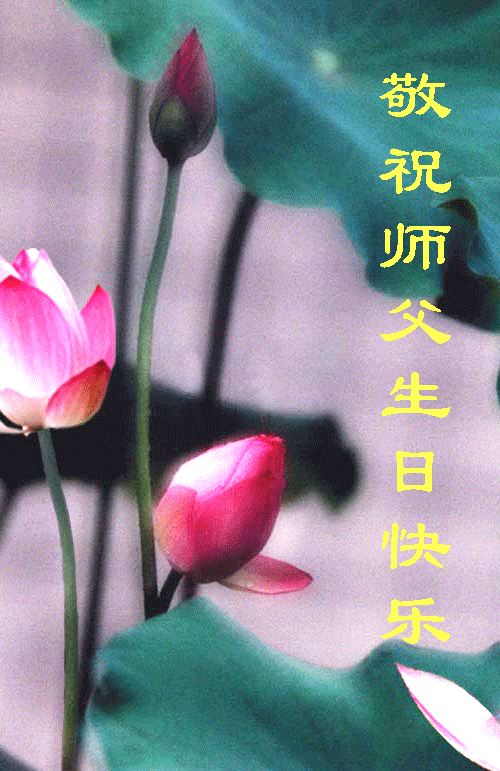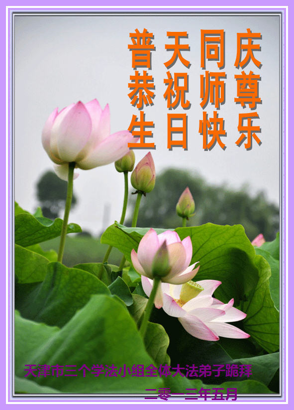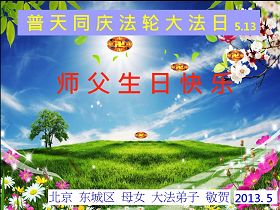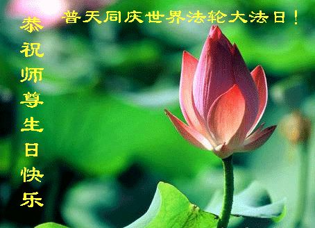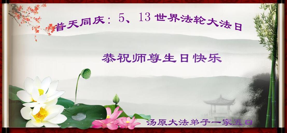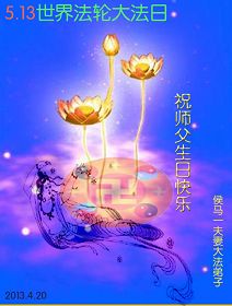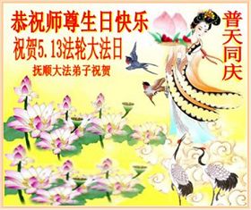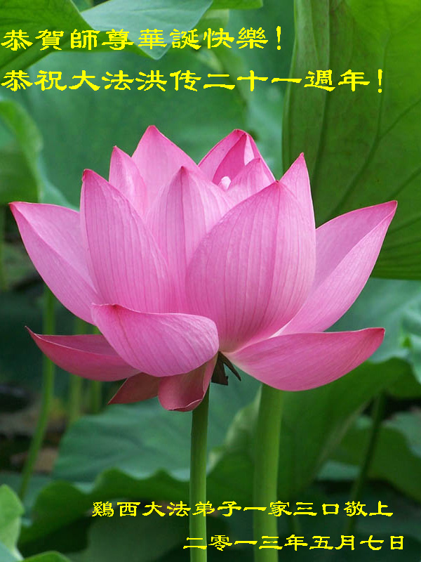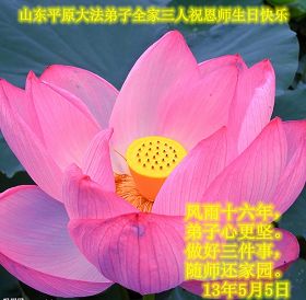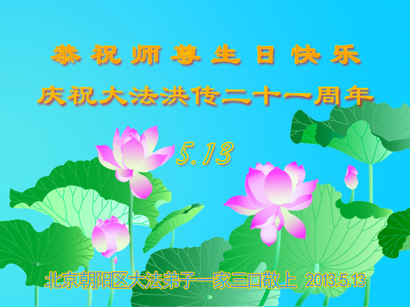 一九九二年五月十三日,慈悲伟大的师父将法轮大法传出,正大穹,救众生。在风风雨雨中,大法历经二十一年的洪传,创造了宇宙的辉煌。是师父转动法轮,力挽狂澜,挽救苍穹使其圆容不灭;是师父慈悲普度,使无量众生得以救度;师父的洪恩浩荡永耀寰宇。五月十三日也是伟大的师尊您的生日。在这普天同庆欢快的伟大日子里,我们一家三口恭恭敬敬的给师父您献上最真诚的祝福!师父,我们决不辜负您的慈悲苦度,一定学好法,做好“三件事”,紧跟正法進程,圆满随师还。再次感谢伟大的师父!