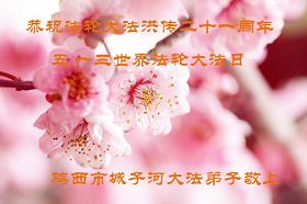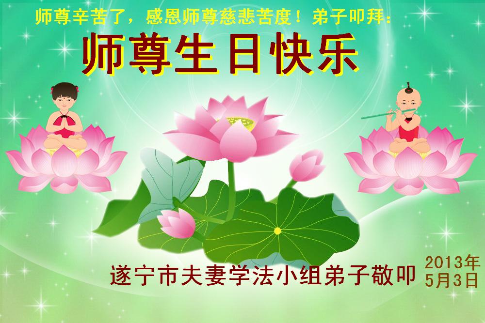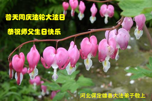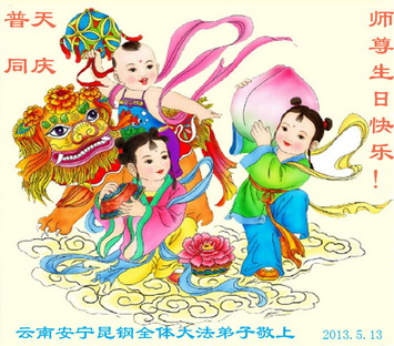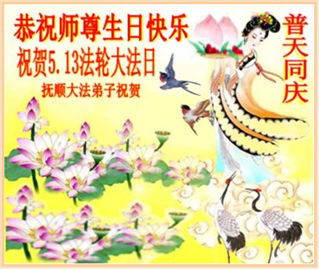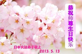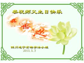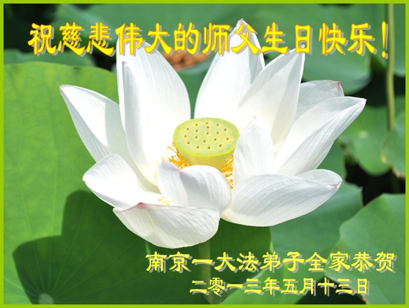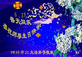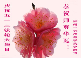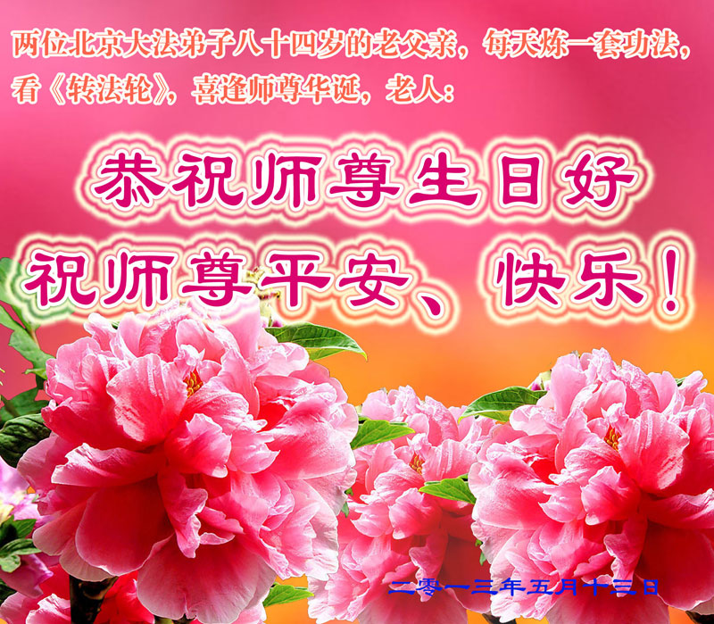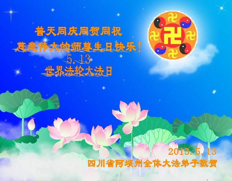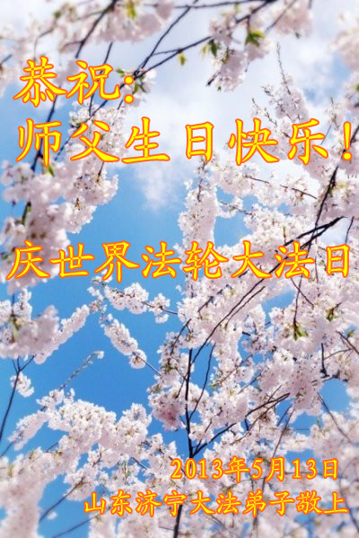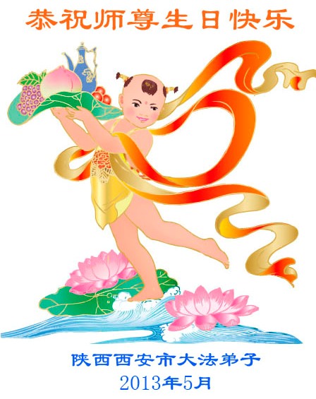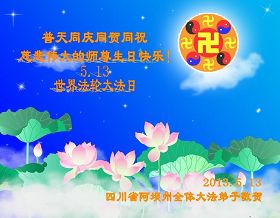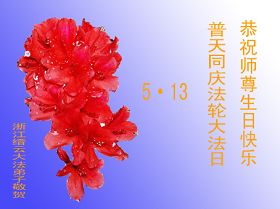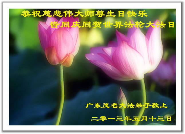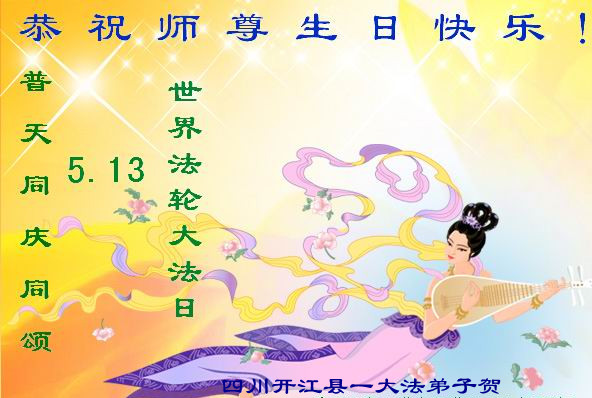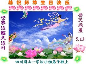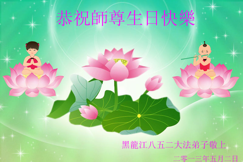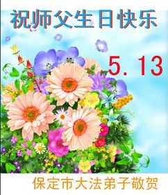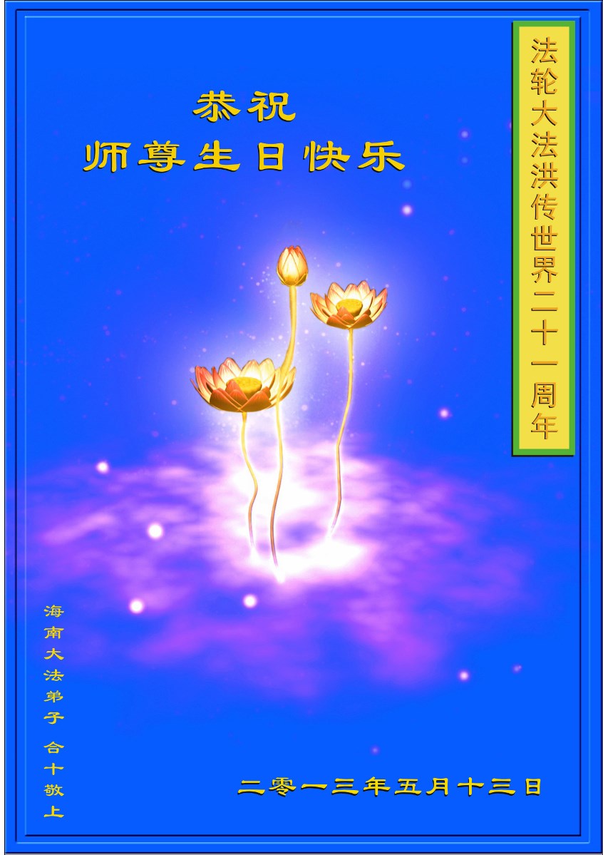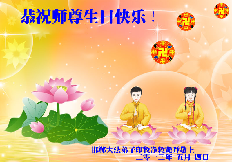 一九九二年五月十三日,慈悲伟大的师父将法轮大法传出,正大穹,救众生。在风风雨雨中,大法历经二十一年的洪传,创造了宇宙的辉煌。是师父转动法轮,力挽狂澜,挽救苍穹使其圆容不灭;是师父慈悲普度,使无量众生得以救度;师父的洪恩浩荡永耀寰宇。五月十三日也是伟大的师尊您的生日。在这普天同庆欢快的伟大日子里,我们一家三口恭恭敬敬的给师父您献上最真诚的祝福!师父,我们决不辜负您的慈悲苦度,一定学好法,做好“三件事”,紧跟正法進程,圆满随师还。再次感谢伟大的师父!