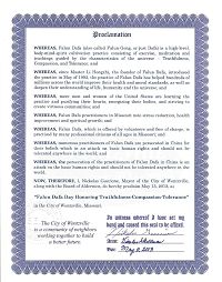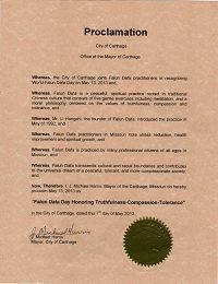 美国密苏里州迦太基市市长迈克尔·哈里斯于五月七日颁发褒奖令,褒奖法轮大法,宣告二零一三年五月十三日为密苏里州迦太基市“法轮大法日”。