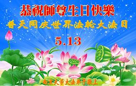 江苏省南京大学大法弟子恭祝慈悲伟大的师尊生日快乐!普天同庆5.13世界法轮大法日!辽宁省大连教育系统大法弟子恭祝慈悲伟大的师尊生日快乐!辽宁省大连东北财经大学全体大法弟子恭祝慈悲伟大的师尊生日快乐!山东省烟台教育系统大法弟子全体大法弟子祝师尊生日快乐!庆祝五月十三日法轮大法日,辽宁省大连一教师祝师尊生日快乐!跪谢师尊慈悲呵护。
