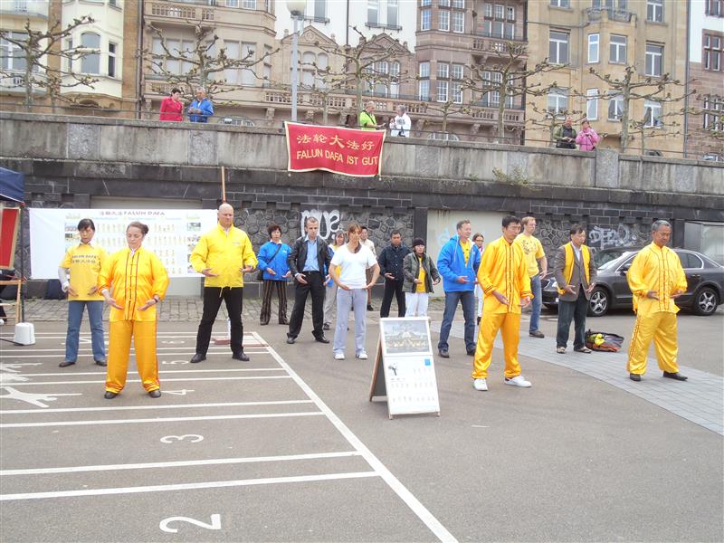 多位学员身着金黄色炼功服,随着炼功音乐,向人们展示着缓、慢、圆的法轮功功法。优美的音乐,舒展的动作,祥和的气氛,感染和吸引着过往的游人。人们放慢脚步,有的驻足观看,有的拿出相机拍照,有的聆听学员给他们讲述法轮功,也有的想要学炼法轮功。当人们看到这么祥和优美的功法,在中国大陆却遭到中共独裁政权的迫害真相时,表示愤慨,并签名反对迫害法轮功。