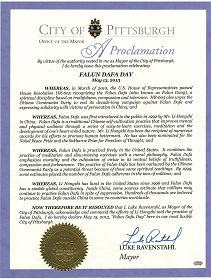 因此,我,卢克•瑞文斯朵(Luke Ravenstahl),以匹兹堡市市长的名义感谢和表彰李洪志先生及法轮大法修炼。我宣布二零一三年五月十三日为我们最宜居的匹兹堡市的“法轮大法日”。