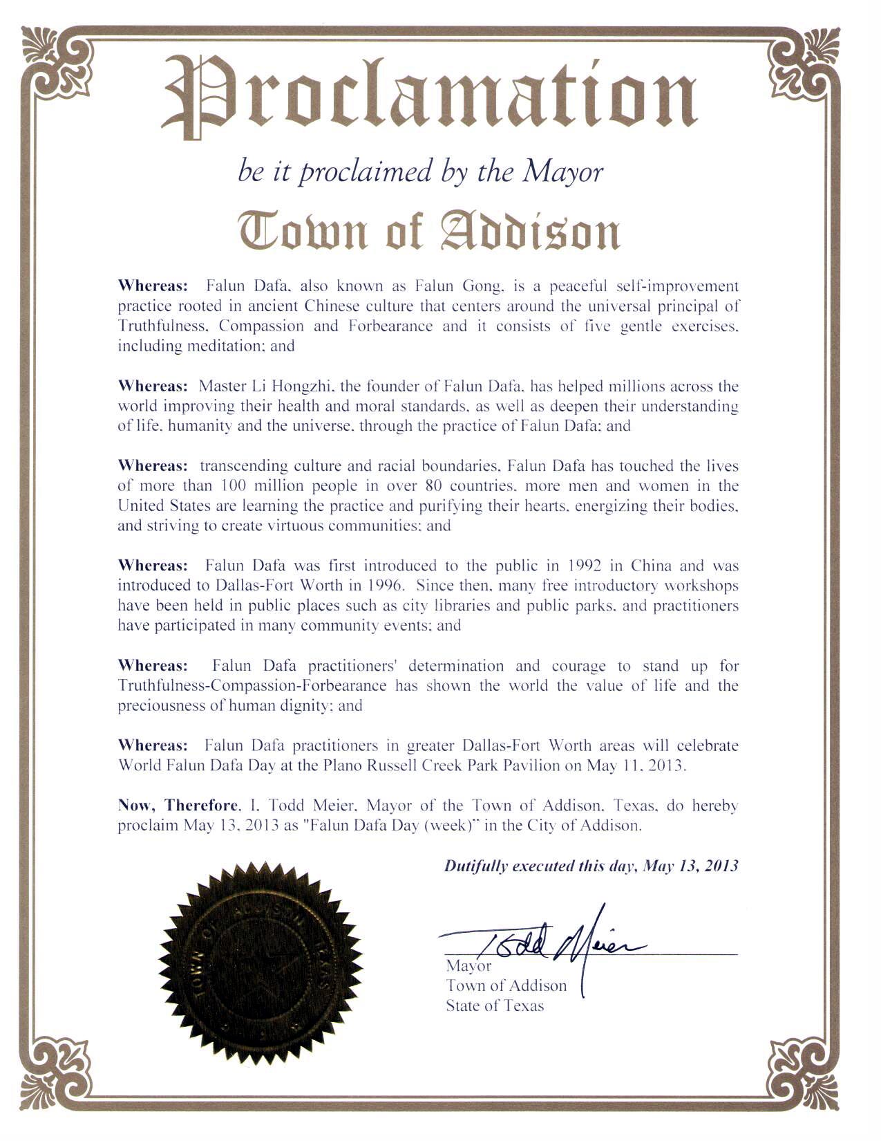 【明慧网二零一三年五月十四日】美国德州达拉斯-福特沃斯地区法轮功学员于二零一三年五月十一日在布兰诺Russell Creek公园举办活动庆祝世界法轮大法日和法轮大法洪传二十一周年。德克萨斯州爱迪逊市(Addison)市长陶德·密伊尔(Todd Meier)颁发褒奖,宣布五月十三日为法轮大法日。