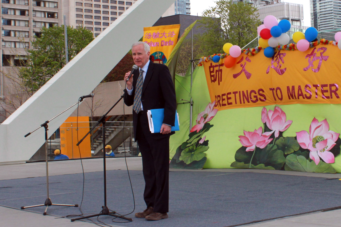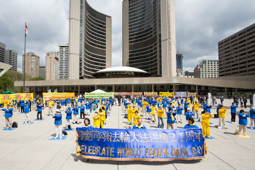 二零一三年五月十三日,加拿大多伦多法轮功学员和民众在多伦多市政广场以集体炼功、歌舞、音乐、朗诵等各种形式,颂扬真、善、忍的美好,感恩大法给他们带来的身心巨变。加拿大联邦部长、国会议员及安省、多伦多市议员等政要到场演说,赞扬法轮功学员坚持反迫害的努力,以及对加拿大社区做出的贡献。加拿大自然资源部部长表示,加拿大得益于法轮功创始人李洪志先生的教导;国会议员呼吁要继续努力制止在中国发生的强行器官移植。最后,政要们和民众一起高呼:“法轮大法好!”声音在多伦多市政广场上回荡着……