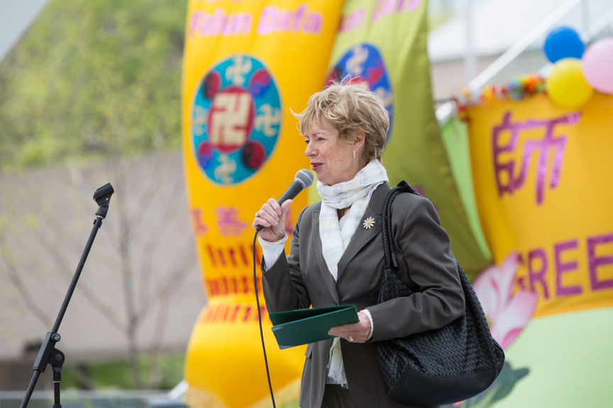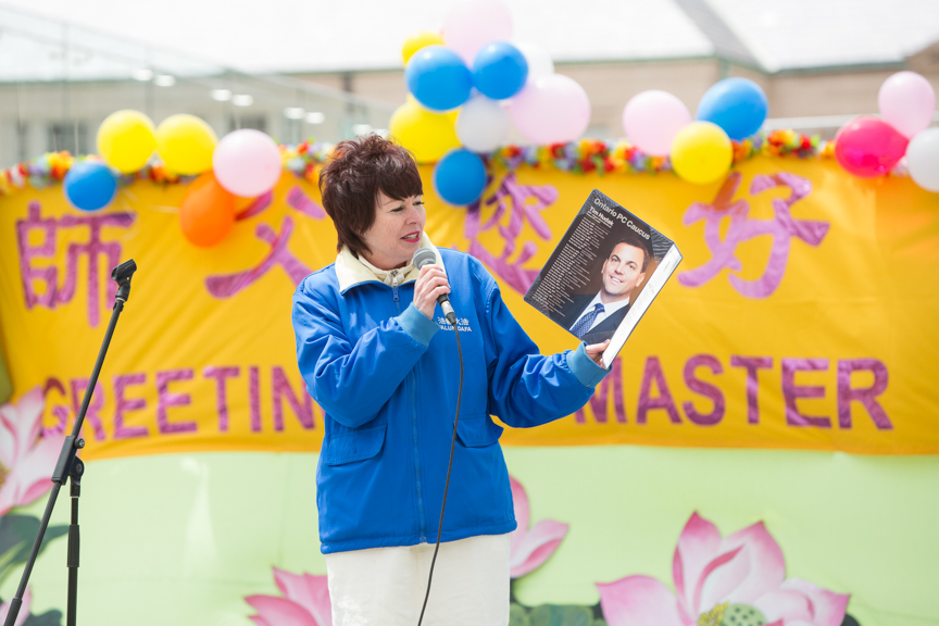 安省议员 Jane McKenna穿着法轮功学员的蓝色外套走上演讲台,她代表安省反对党领袖胡达克(Tim Hudak)前来祝贺。她说:“我们很高兴今年又来参加庆祝,向每一个人致以最热情的问候。”