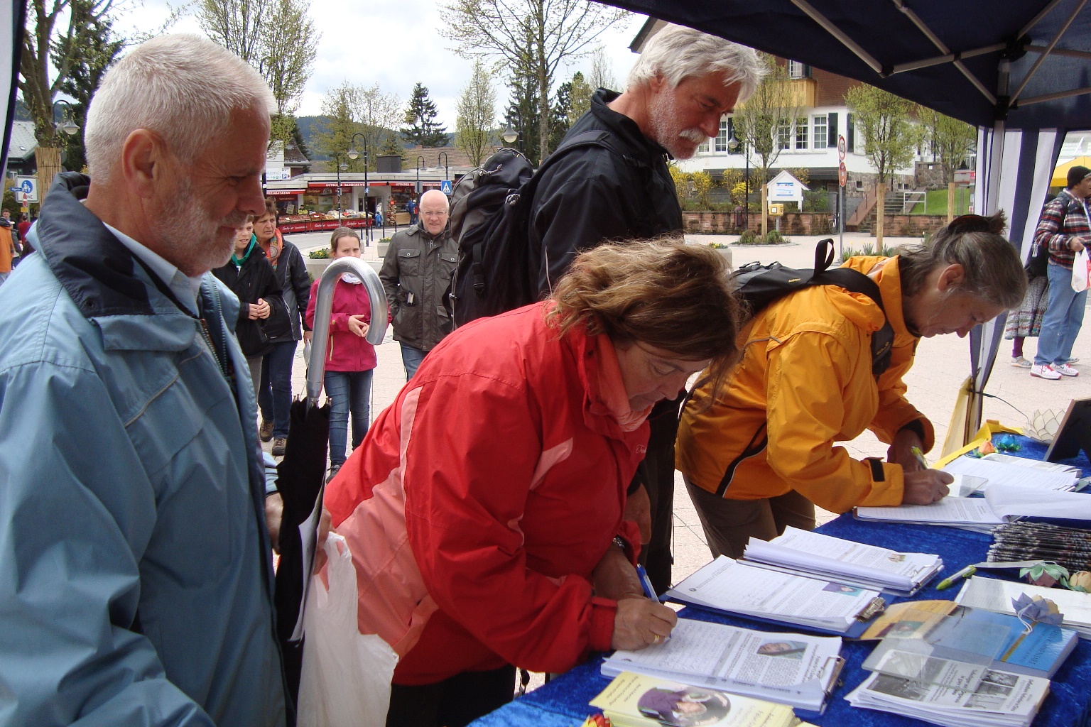 一位德国女士听到法轮功学员说中共在迫害法轮功,甚至活体摘取法轮功学员的器官,贩卖牟利,她流泪了,说:“没想到今天的人类会如此的残忍。”她在反迫害征签表格上签上了自己的名字。