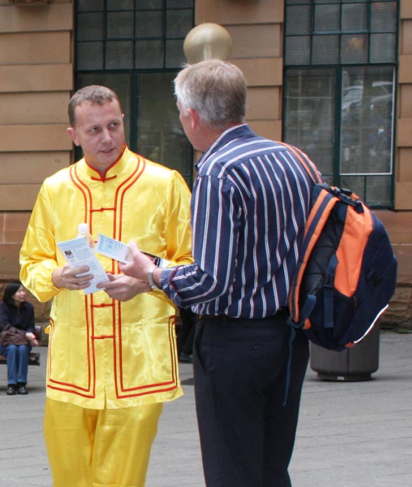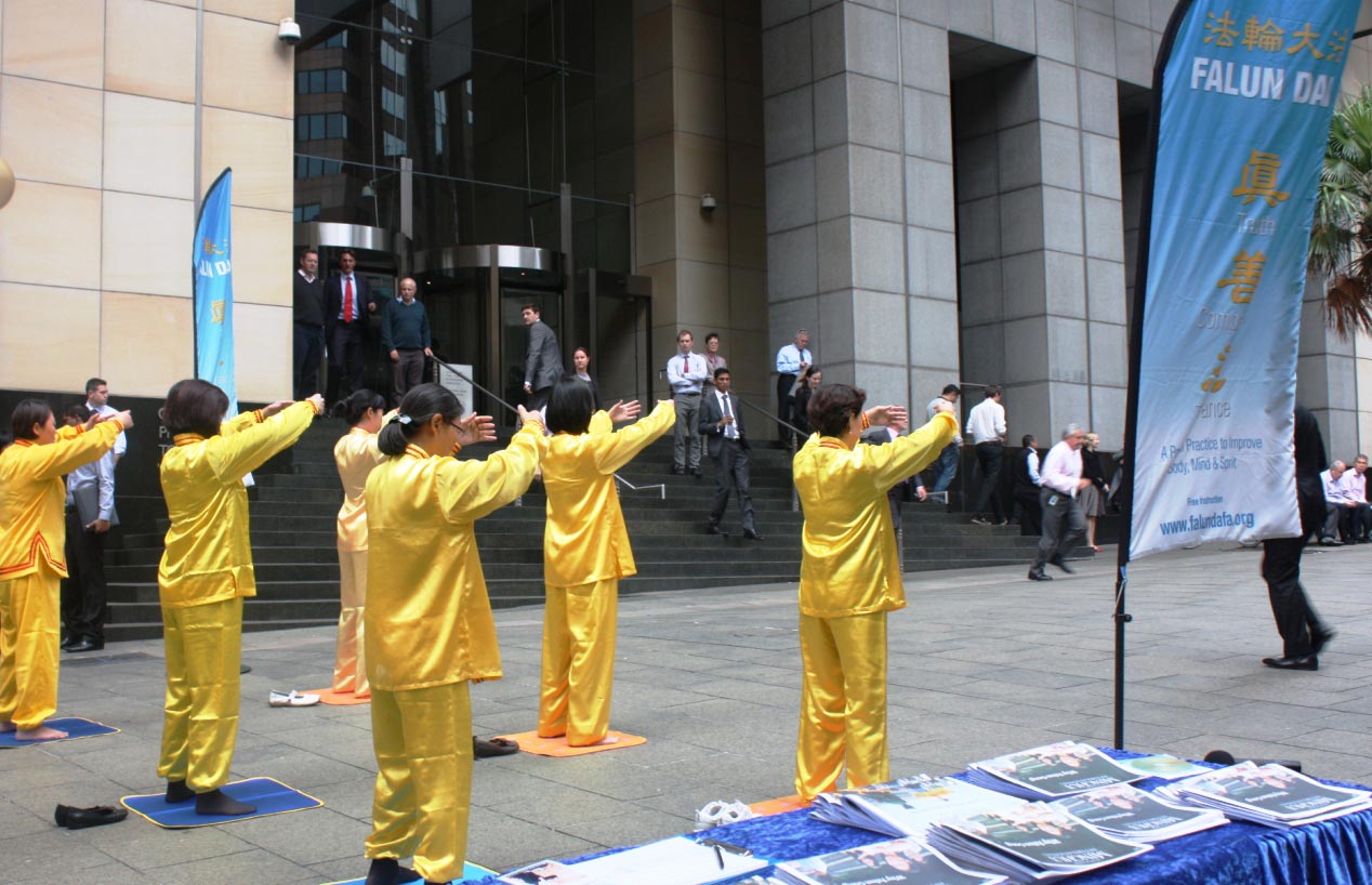 学员们身着金黄色炼功服、面带微笑祥和地向观众演示五套功法,吸引了旁边大楼里众多的政、商界工作人员驻足观看。功法演示过程中,法轮大法悉尼佛学会发言人约翰·戴乐先生向观众们介绍了什么是法轮大法和法轮大法洪传二十一年来,在一百多个国家有上亿人修炼的盛况,他还讲述了在中国的法轮功学员十几年来无辜所遭受的迫害。
