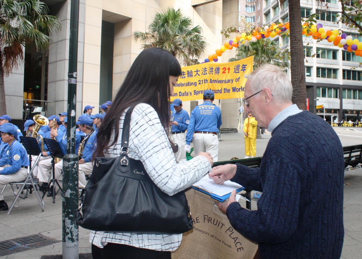 在演出台附近放置了真相图片展板和反迫害征签台。了解真相的民众,纷纷在呼吁制止迫害的征签表格上签名。法轮功学员Janny Zhen在短时间内就征得了好几十个签名。她说:这里是金融、政治中心,人们走过都很匆忙,但还是非常善意地接过我们递给的真相资料,很多人签名。很多人对法轮功真相比较了解,也很支持。