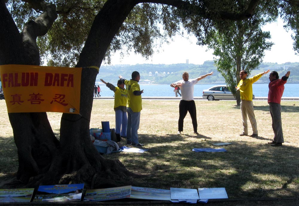 从下午直到晚上,学员们在里斯本的oeira区国家体育场的国家公园(Parque de National)继续弘法,讲法轮功真相,很多人接单后表示回家再读传单,了解真相,不少年轻人驻足观看功法。