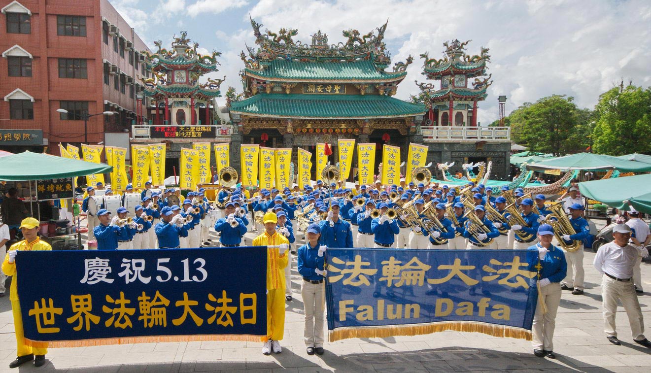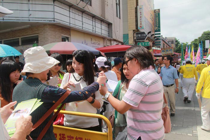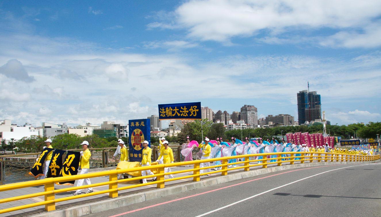 游行队伍来到安平后,受邀在天后宫前广场做定点表演。安平开台天后宫管理委员会总干事陈宏明表示,女儿是法轮功学员,他因此认识了法轮功十多年,而女儿原来不理想的身体已变得非常好,他也了解法轮功对人的心灵及道德有提升的帮助,并深信大法能够带给大家幸福的未来。