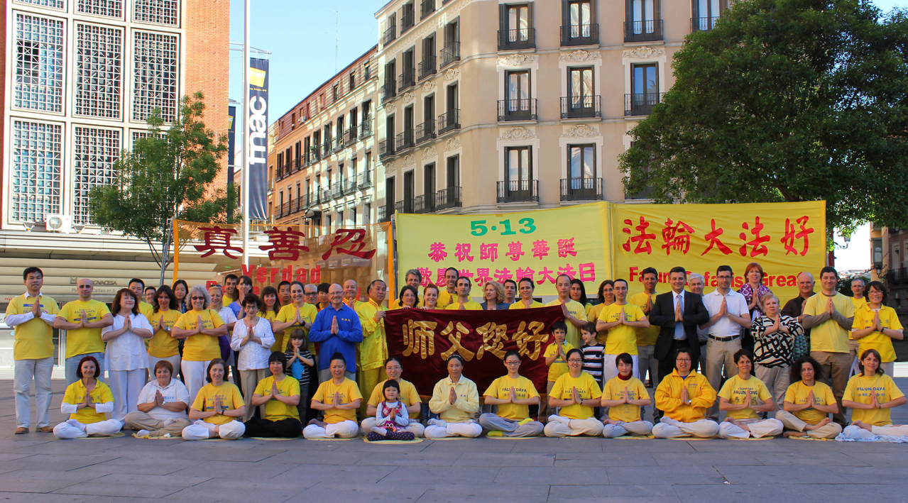 五月十三日也是法轮大法创始人李洪志师尊六十二华诞。庆祝活动即将结束时,西班牙法轮功学员在写有“恭祝慈悲伟大的师尊华诞暨世界法轮大法日”的横幅前,对着摄影镜头齐声问候师尊,恭祝“师父生日快乐!”并合影留念。