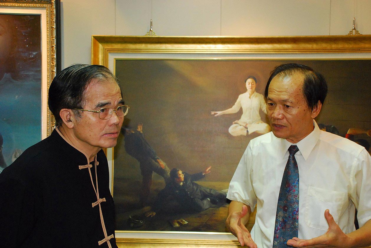 云林县浊水溪书画学会理事长谢美在参观了画作后赞赏说:“今天所看到的都是艺术家精心的杰作,所有从事艺术工作者都有必要来这里观摩。”他特别欣赏《绣法轮》这幅画作,他说:“这幅画发挥的淋漓尽致,灯光黑暗分明,该有光泽的地方就有光泽,该暗的地方就暗,我特别欣赏这位画中的女士的专心、专注,我觉得这是一幅成功的画作。”