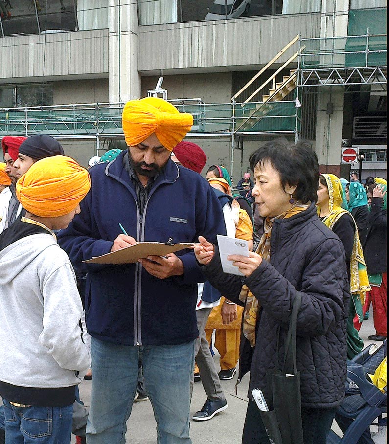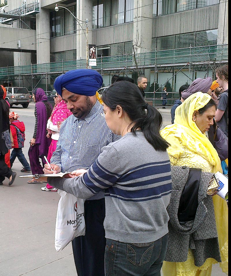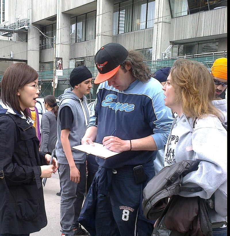 一位社会工作者倾听了学员们讲述的真相后,反复地询问:“我怎样才能帮助你们呢?”后来他自己在“制止活体摘取”的签名表上签名,并拿了五张签名表到广场找他的朋友签,半个小时后他拿着征签好的五张(四十人)的签名交到同修手中。接着他又要了一张空白的签名表,他说我住在多伦多周边的一个城市,我会复印一些签名表,让我所有的朋友和亲人签,后来他留下了电话和联络地址。