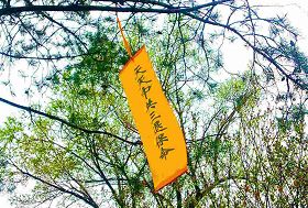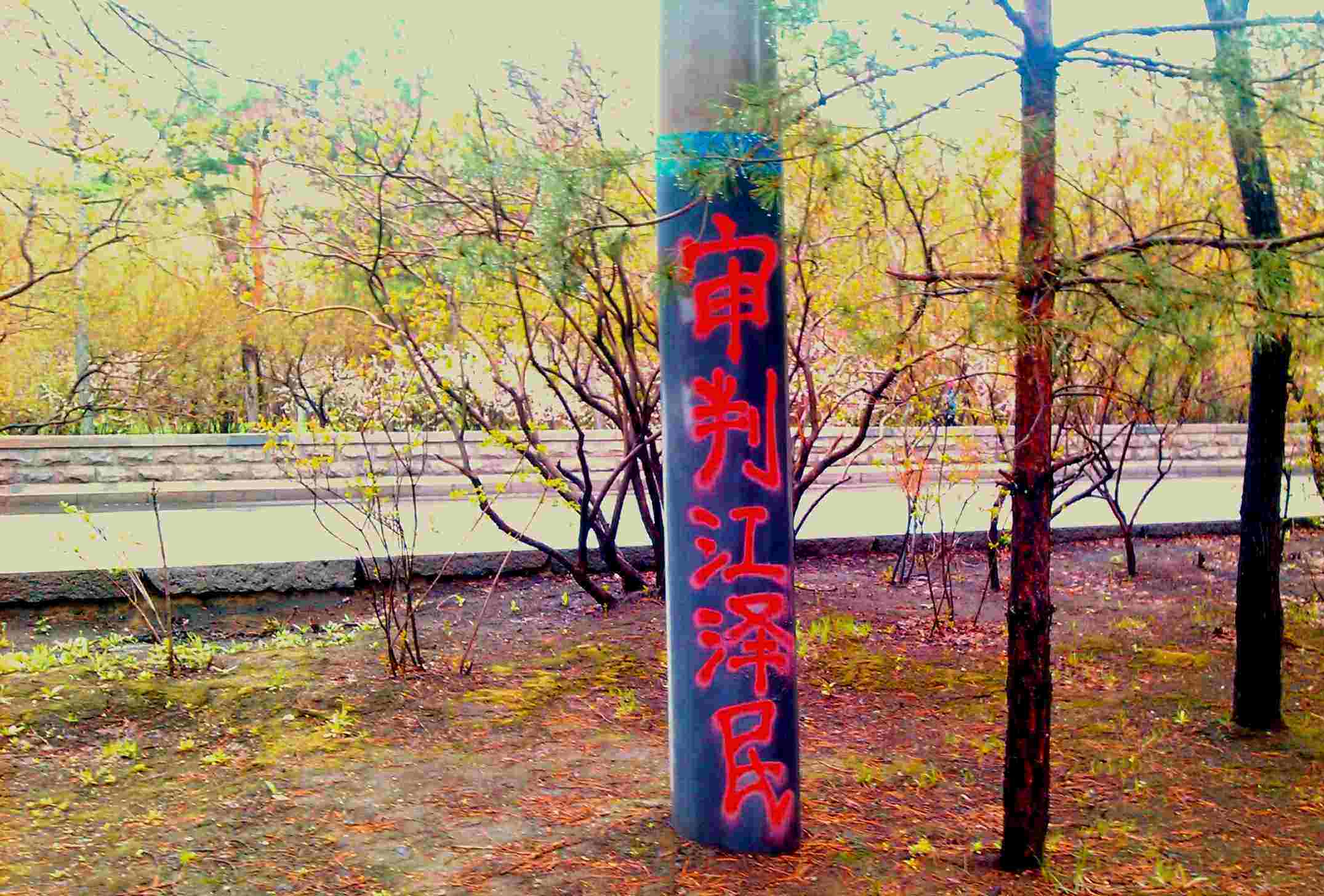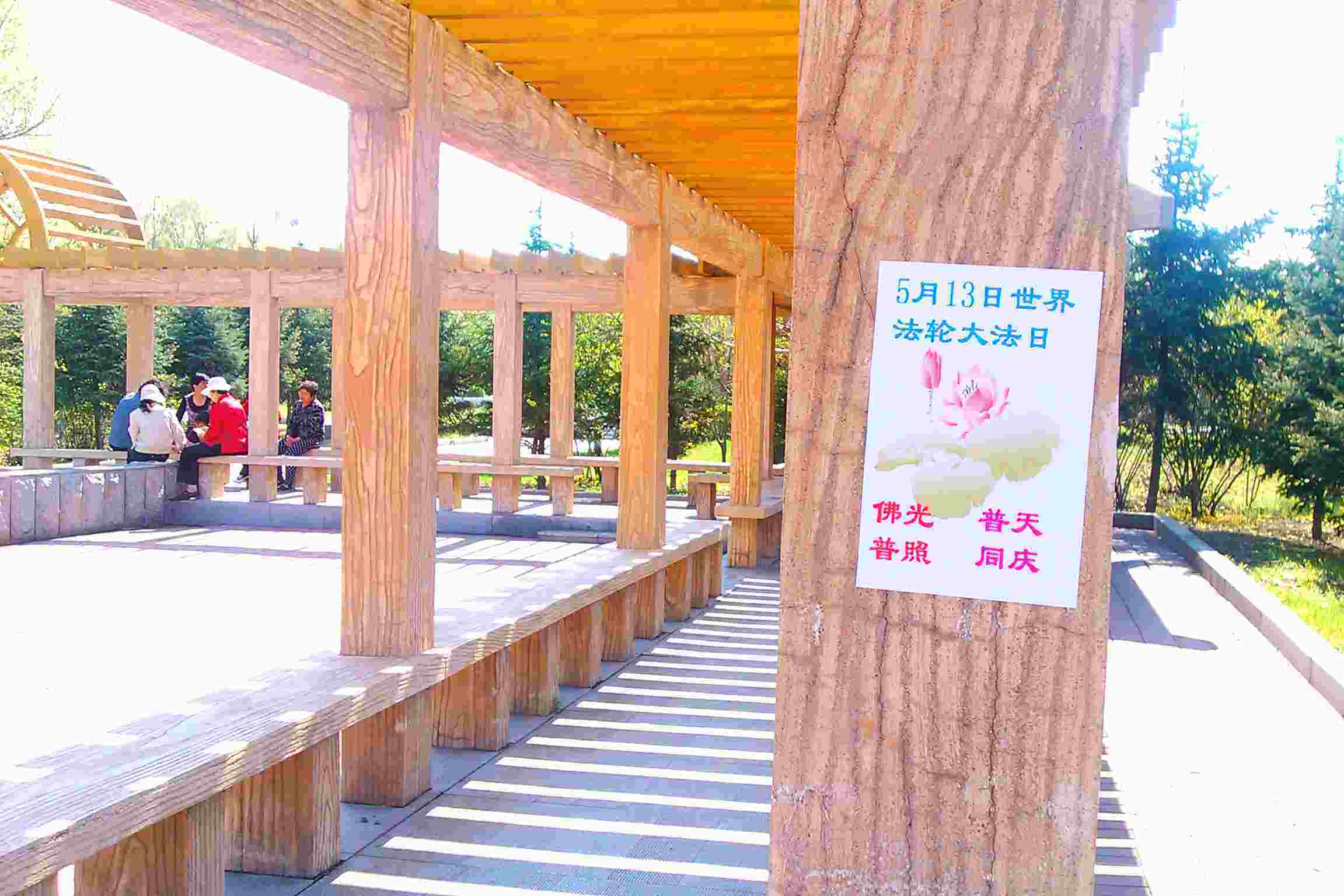 条幅上写着:“法轮大法好”、“世界需要真善忍”、“天灭中共三退保命”;在公园一块巨石上写着标语:“依照宪法废除劳教制度,停止酷刑迫害!”;在林荫小道、公路两边的电线杆上写着:“庆祝5.13世界法轮大法日”、“普天同庆”、“审判江泽民”、“天灭中共,退党保命”等真相标语。