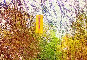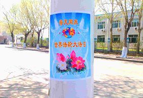 【明慧网二零一三年五月二十二日】(明慧网通讯员黑龙江报道)五月十三日世界法轮大法日前夕,在中国大陆黑龙江省某市林荫小道、公园、休闲广场附近、街道两边及菜市场的树上飘扬着金色的真相条幅、粘帖。