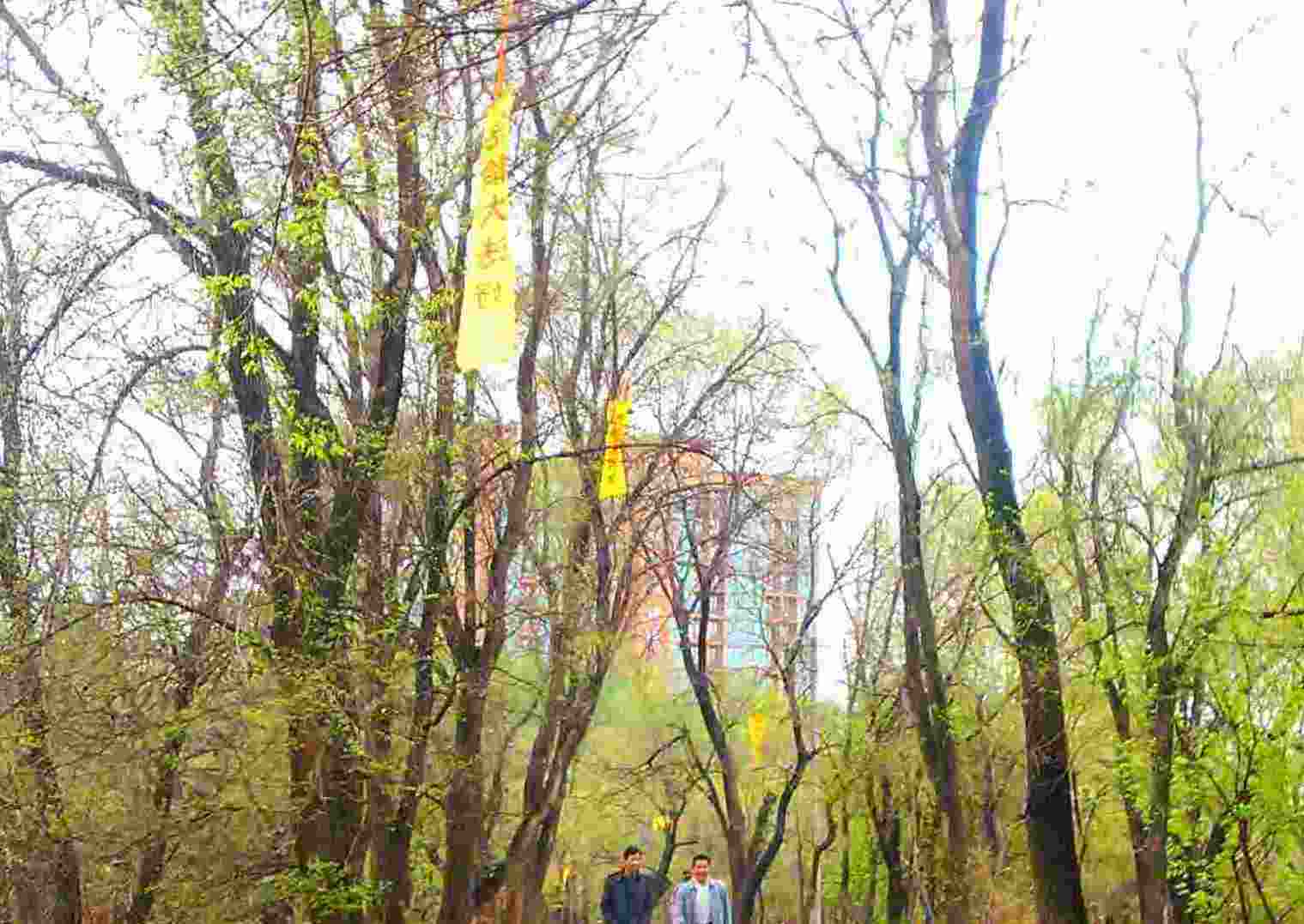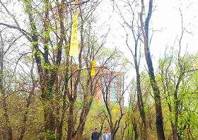 晨练、散步的人们走在林荫小道上,头上悬挂着金色的条幅与路旁的绿树及周围粉色的毛桃花及紫色的丁香花构成一道道亮丽的风景画。