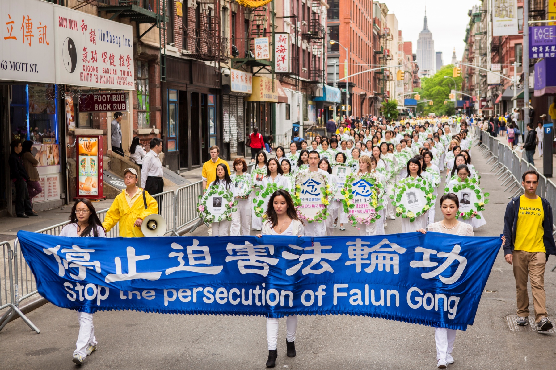 五月十八日,来自世界各地的法轮功学员汇集纽约曼哈顿中国城举行纪念法轮大法洪传二十一周年大游行