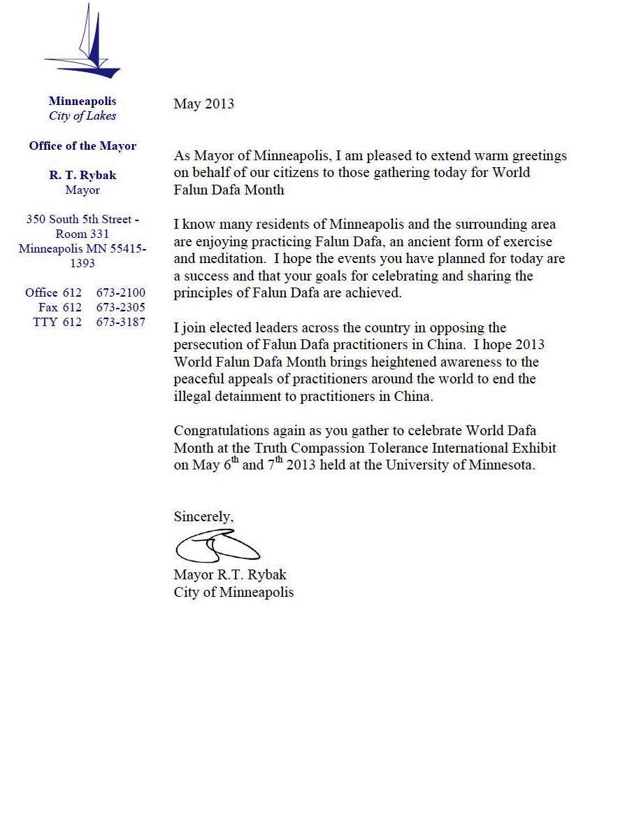 日前,明尼阿波利斯市长R.T. Rybak为即将到来的法轮大法月及真善忍国际美展发来了贺信。