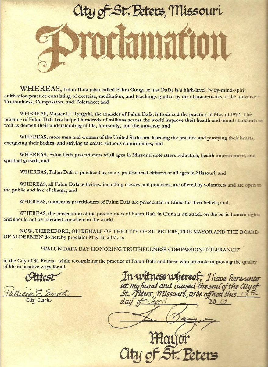 【明慧网二零一三年五月六日】美国密苏里州圣彼得市(St. Peters)市长蓝•帕格诺(Len Pagano)二零一三年四月十八日签署褒奖令,褒奖法轮大法,宣告二零一三年五月十三日为密苏里州圣彼得市“法轮大法日”以颂扬“真、善、忍”。
