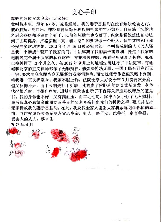 湖北通城县法轮功学员雷胜利女士于二零一三年三月二十六日被非法判刑三年,四月十九日被投入武汉女子监狱。当地民众继续联名要求释放雷胜利。