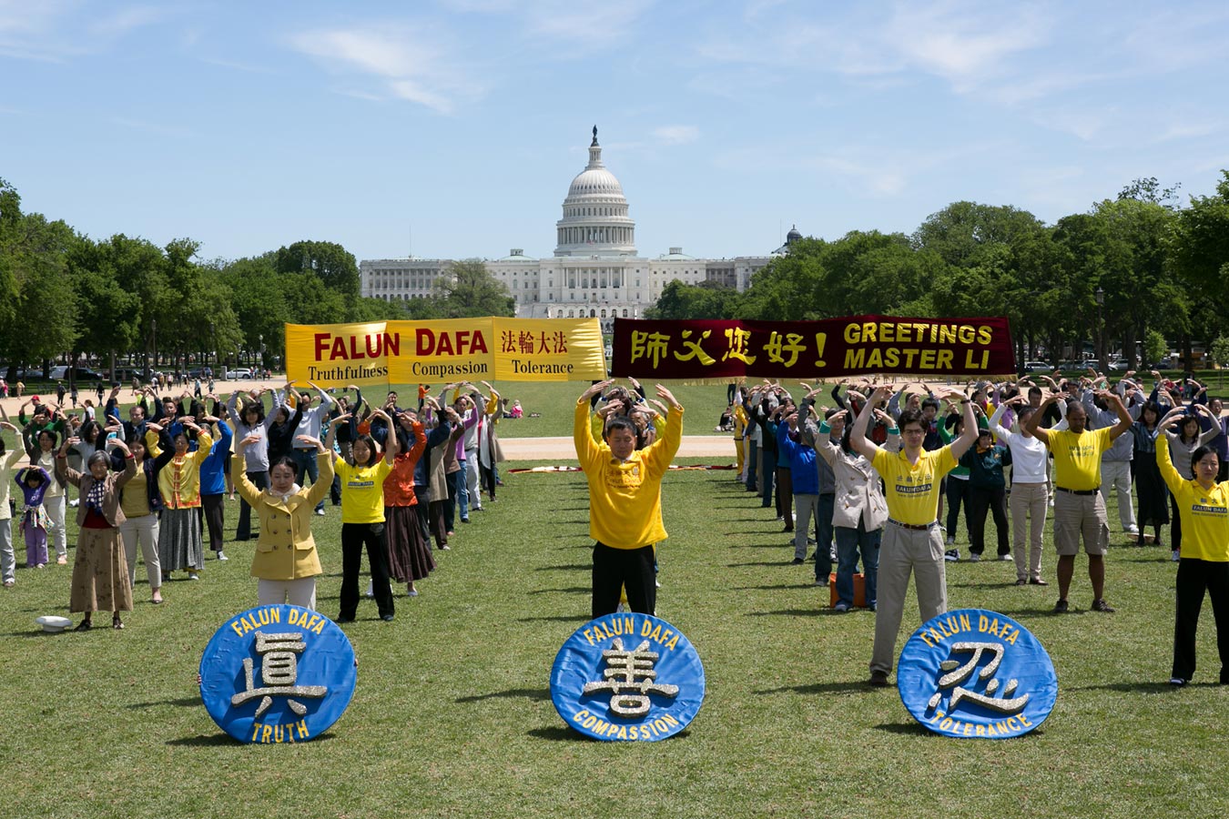 五月四日,碧空如洗,风和日丽。从早上九点开始,大华府地区法轮功学员们来到世界游客云集的航空航天博物馆对面的国家大草坪集体炼功,祥和宁静的场面吸引了众多过往的游客和行人,他们好奇地询问着,有的游客现场跟着法轮功学员学炼功法。