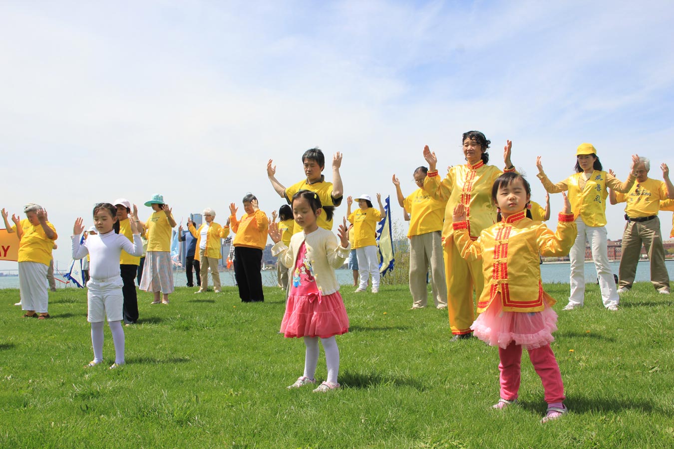 法轮功学员们在美加边境的底特律河畔集体炼功