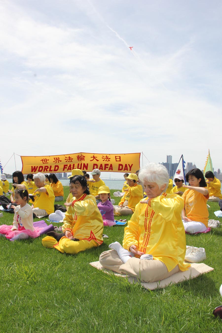 “庆祝世界法轮大法日”的横幅被五彩旌旗簇拥着,中西方法轮功学员们在美丽的河畔开始了集体炼功。他们当中有得法不到一年的新学员,也有已经得法近二十年的老弟子;有童稚的大法小弟子们,也有青少年的修炼者;有名校毕业的工程师和科学家,也有普通的社会一员,因为共同对“真善忍”的信仰,他们走到了一起,走过了风雨十四年的反迫害路程。