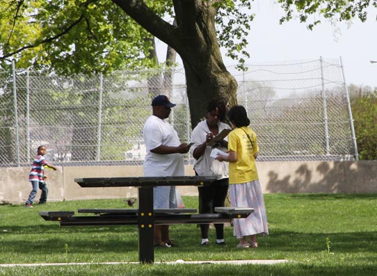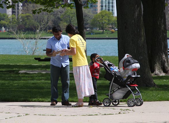 晴朗的天气让很多密西根的民众走了出来,一家人或朋友们三三俩俩的在公园里聚会,学员们拿着反迫害,停止活摘器官的征签簿,借机走进人群,走进一个个家庭聚会,向人们讲述什么是法轮功,在中国大陆被迫害的真相,特别是中共活摘法轮功学员器官这个令人发指的罪恶。