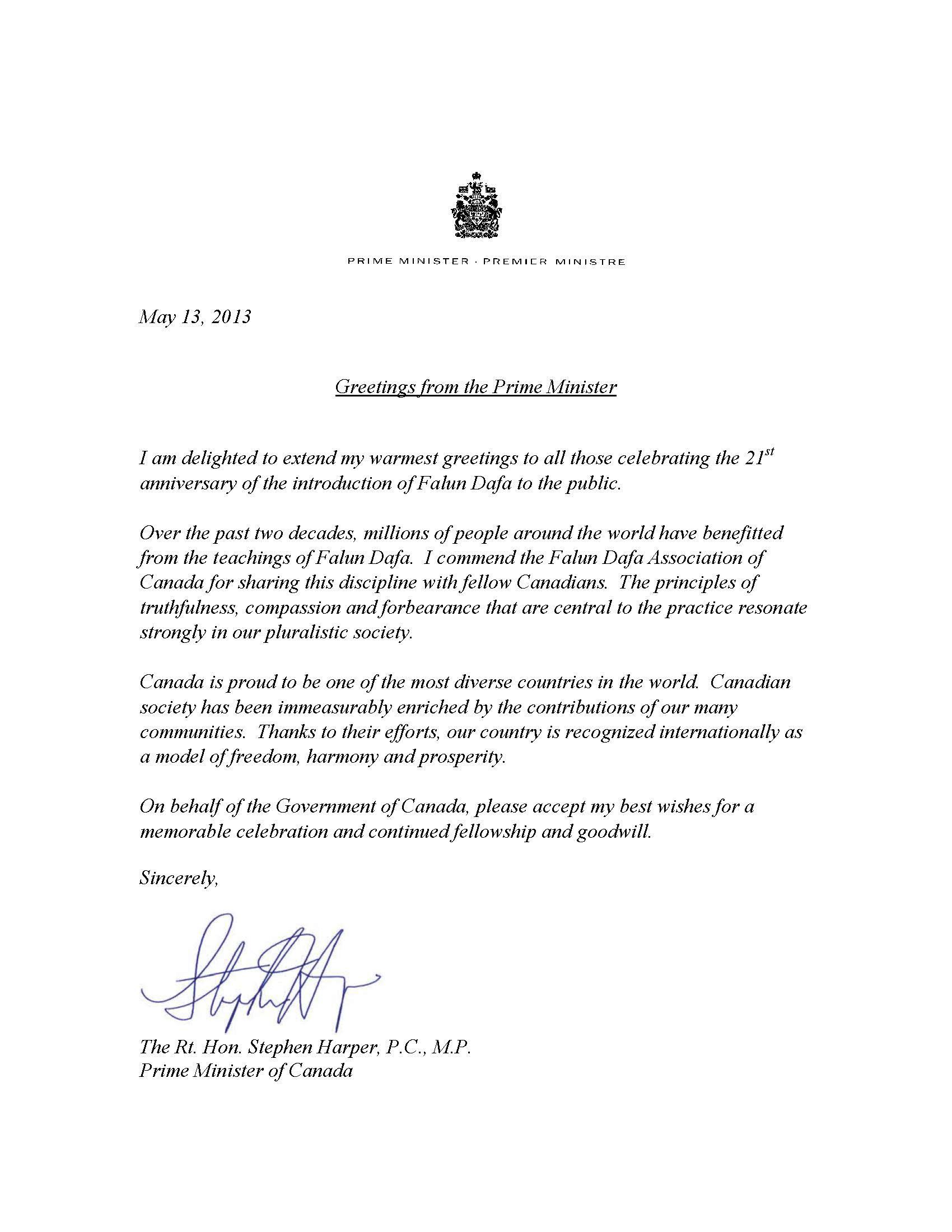 ![]() 加拿大总理斯蒂芬•哈珀 | ![]() 加拿大总理斯蒂芬•哈珀发来的贺信 |