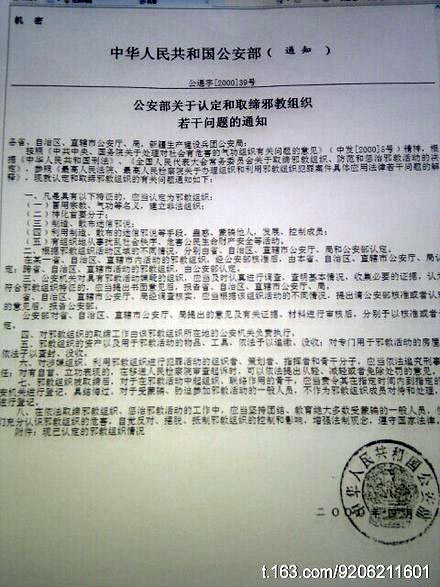 所谓“国家机密文件”:“公通字【2000】39号公安部关于认定和取缔邪教组织若干问题的通知”