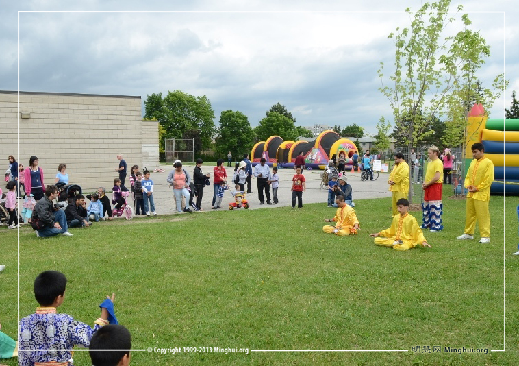 【明慧网二零一三年六月十日】 (明慧记者章韵多伦多报道)二零一三年六月八日,一个晴朗的星期六,加拿大大多伦多地区北约克市(North York)的一间学校(Cherokee Public School)在校园里举办了慈善捐款活动。活动中孩子们表演着各国各民族的舞蹈,多伦多法轮功学员组成的莲花艺术团应邀参加了这次活动,他们的中国古典舞和法轮功功法演示受到了学校师生和家长们的赞赏和欢迎。