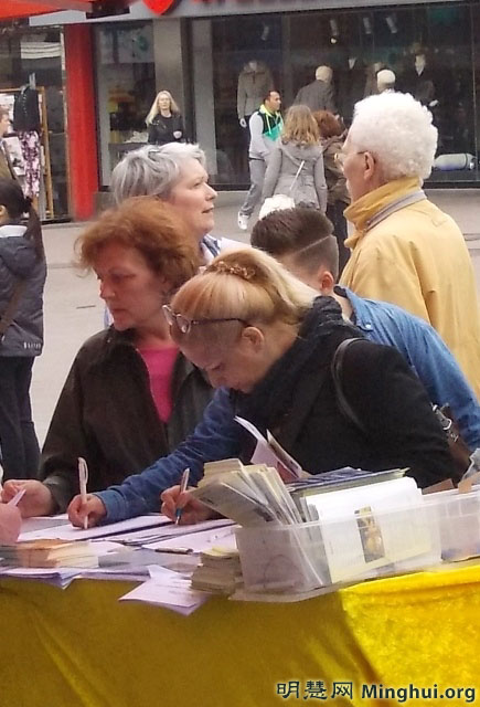 人们纷纷停下脚步,了解中共迫害法轮功的真相,并在反迫害和反活摘器官签名表上踊跃签名。