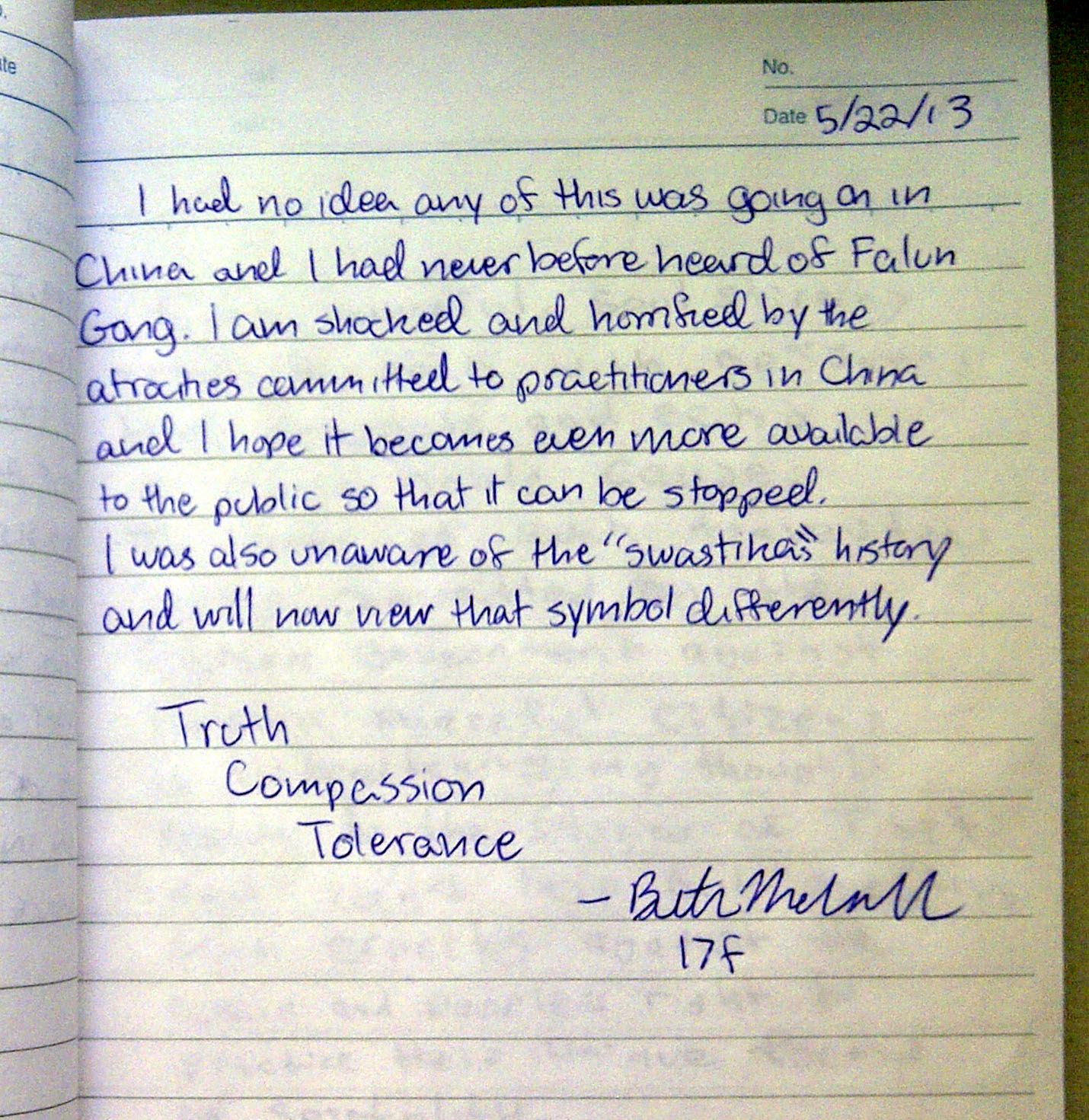 (在此之前)我一点也不知道在中国发生了什么,也从未听说过法轮功。我震惊于中国大陆的法轮功学员所承受的暴行是如此的可怕,我希望有更多的公众知道这场迫害,从而能够制止迫害。以前我也不知道卍字符的历史和意义,现在我知道了。真,善,忍。——Butz Melnick