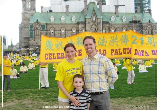 二零一三年五月八日,加拿大首都渥太华国会山前,德鲁与妻子及儿子在法轮大法传世二十一周年庆祝活动现场